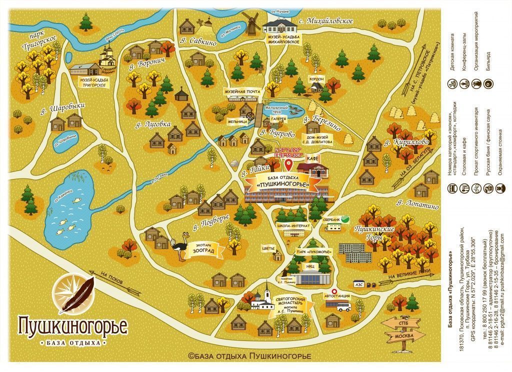 Рядом расположен Государственный мемориальный историко-литературный природно-ландшафтный музей-заповедник А.С. Пушкина «Михайловское». База имеет три современных трехэтажных жилых корпуса круглогодичного действия и летние коттеджи. Отдельно от спальных корпусов – столовая на 300 мест.