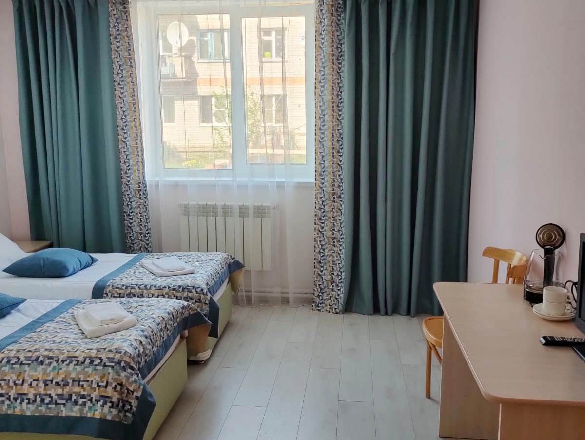 Стандартный номер: Площадь 18 кв.м. Номер состоит из одной комнаты и небольшой прихожей Номер оборудован современной удобной мебелью. В номере имеется: две 1.5-спальные кровати, две тумбочки, рабочий стол, ковровая дорожка. В номере есть туалетная комната с душем. Номер рассчитан на проживание двух человек.