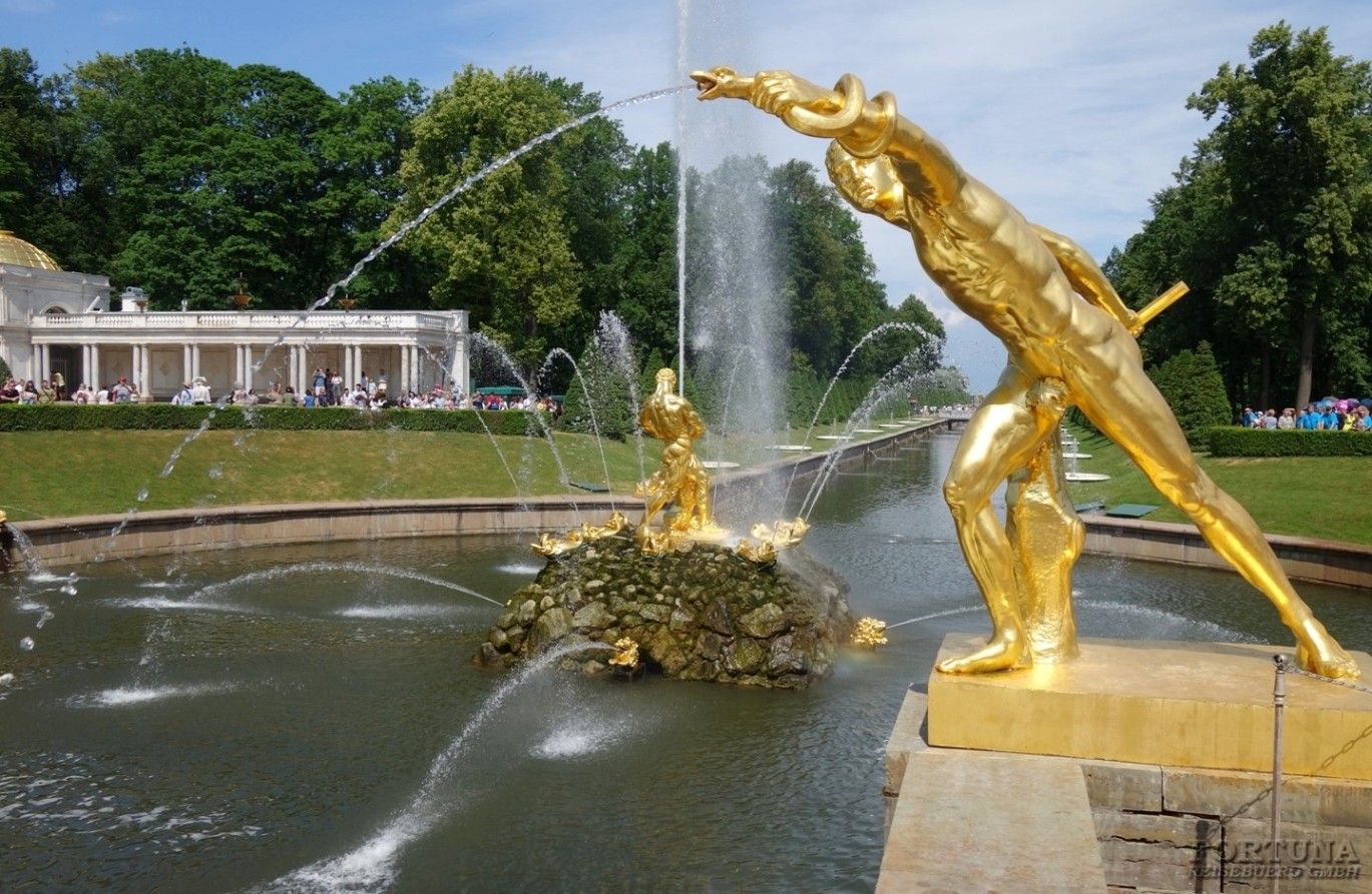 Петергоф всемирно известен как столица фонтанов или "Северный Версаль". Парадные парки, многочисленные фонтаны, каскады, золоченные и мраморные статуи богов и героев древности, пышное убранство дворцов - всё это было призвано утверждать идею торжества России, утвердившейся на Балтийском море. В состав ансамбля входят Большой дворец - изящное здание в три этажа с галереями и куполами, сверкающими позолотой; дворец Коттедж, дворцы Монплезир и Марли, Екатерининский корпус, павильон Эрмитаж. Не меньший интерес представляют Верхний и Нижний парки. Верхний парк в регулярном стиле украшен центральным фонтаном Нептун и многочисленными скульптурами в обрамлении прямых алей. Нижний парк в английском стиле насчитывает свыше 150 фонтанов и 3 монументальных каскадов.