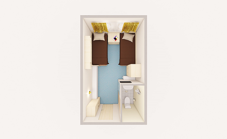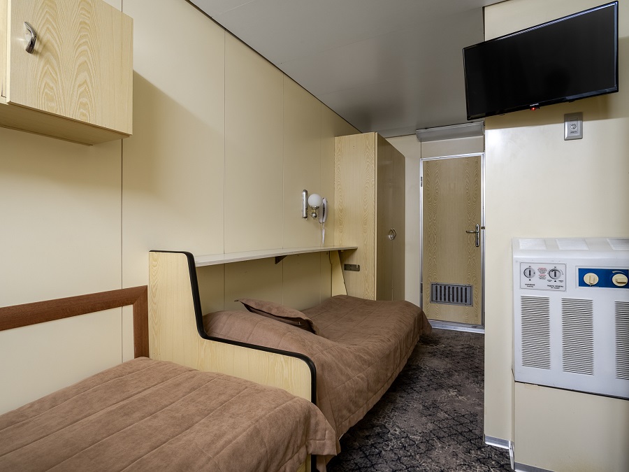 В каюте: две односпальные кровати, шкаф, стол, пуф, зеркало, настенные полки, радио, телевизор с кабельным и спутниковым вещанием, телефон, фен, холодильник, пледы, тапочки, набор посуды, оптимальное кол-во электрических розеток на 220V, щетка для одежды, кондиционер, обзорное окно.