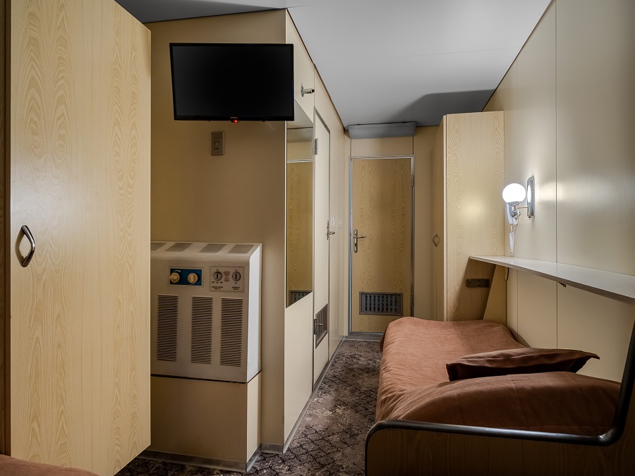 В каюте: одна двуспальная кровать (при необходимости трансформируется в две односпальные кровати), прикроватные тумбы, шкаф, пуф, стол, кресло, зеркало, вешалка для верхней одежды, сейф, холодильник, кондиционер, радио, фен, плед для каждого туриста, телефон, телевизор с кабельным и спутниковым вещанием, розетки 220 V, обзорное окно, щетка для одежды, банные халаты, маски для сна, тапочки, набор посуды и столовых приборов, чайная пара, питьевая вода, приветственный набор (игристый напиток, фрукты), капсульная кофемашина (одна чашка кофе на человека – в подарок), мини-бар (за дополнительную плату).