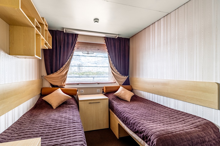 В каюте: две односпальные кровати, шкаф, стол, пуф, зеркало, настенные полки, радио, телевизор с кабельным и спутниковым вещанием, телефон, фен, холодильник, пледы, тапочки, набор посуды, оптимальное кол-во электрических розеток на 220V, щетка для одежды, кондиционер, обзорное окно.