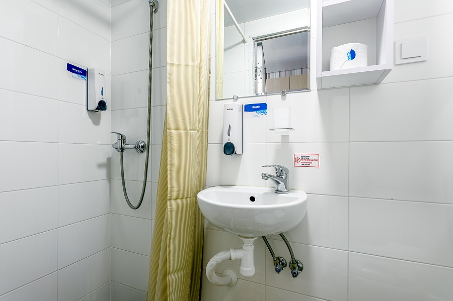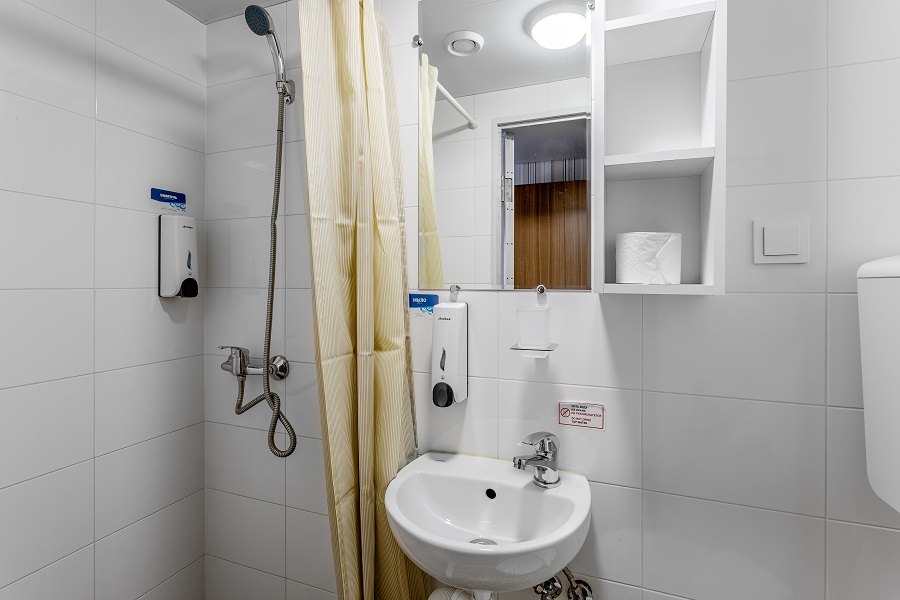 Ванная комната: небольшой отдельный санузел: туалет, раковина, душ. Сам душ - помещение ванной комнаты отгораживается душевой занавеской.Одноместная каюта Комфорт А1
