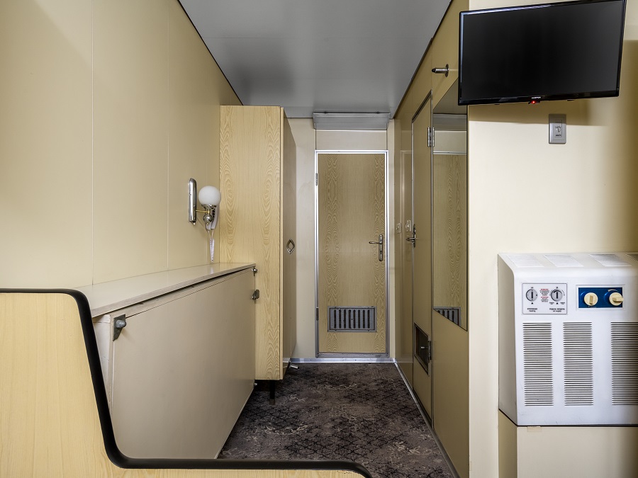 В каюте: одна двуспальная кровать (при необходимости трансформируется в две односпальные кровати), ванная комната (раковина, душевая кабина, туалет), прикроватные тумбы, пуф, стол, зеркало, кресло, вешалка для верхней одежды, журнальный стол, шкаф, сейф, холодильник, телефон, кондиционер, радио, фен, плед для каждого туриста, телевизор с кабельным и спутниковым вещанием, розетки 220 V, обзорные окна.