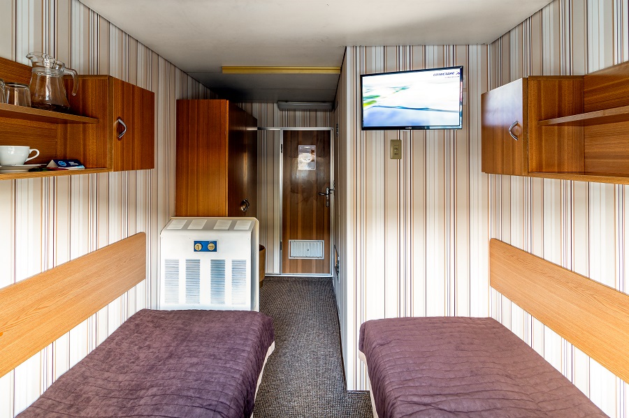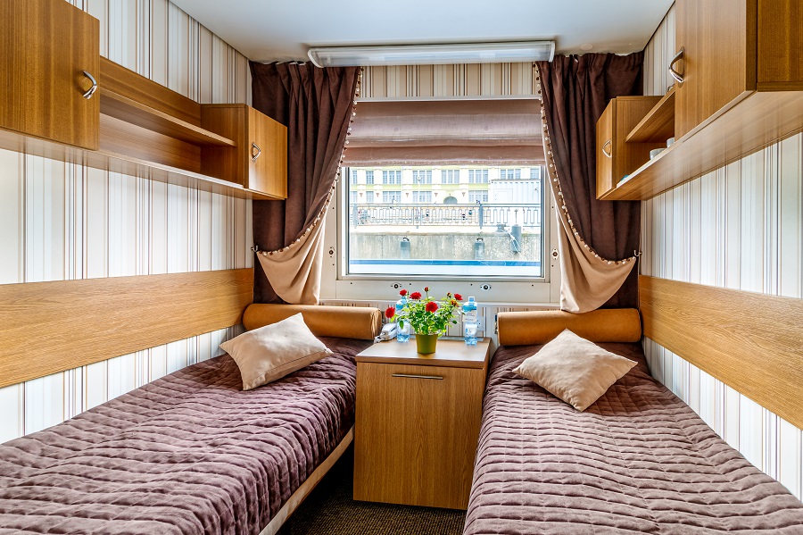 В каюте: две односпальные кровати, шкаф, стол, пуф, зеркало, настенные полки, радио, телевизор с кабельным и спутниковым вещанием, телефон, фен, холодильник, пледы, тапочки, набор посуды, оптимальное кол-во электрических розеток на 220V, щетка для одежды, кондиционер, обзорное окно.