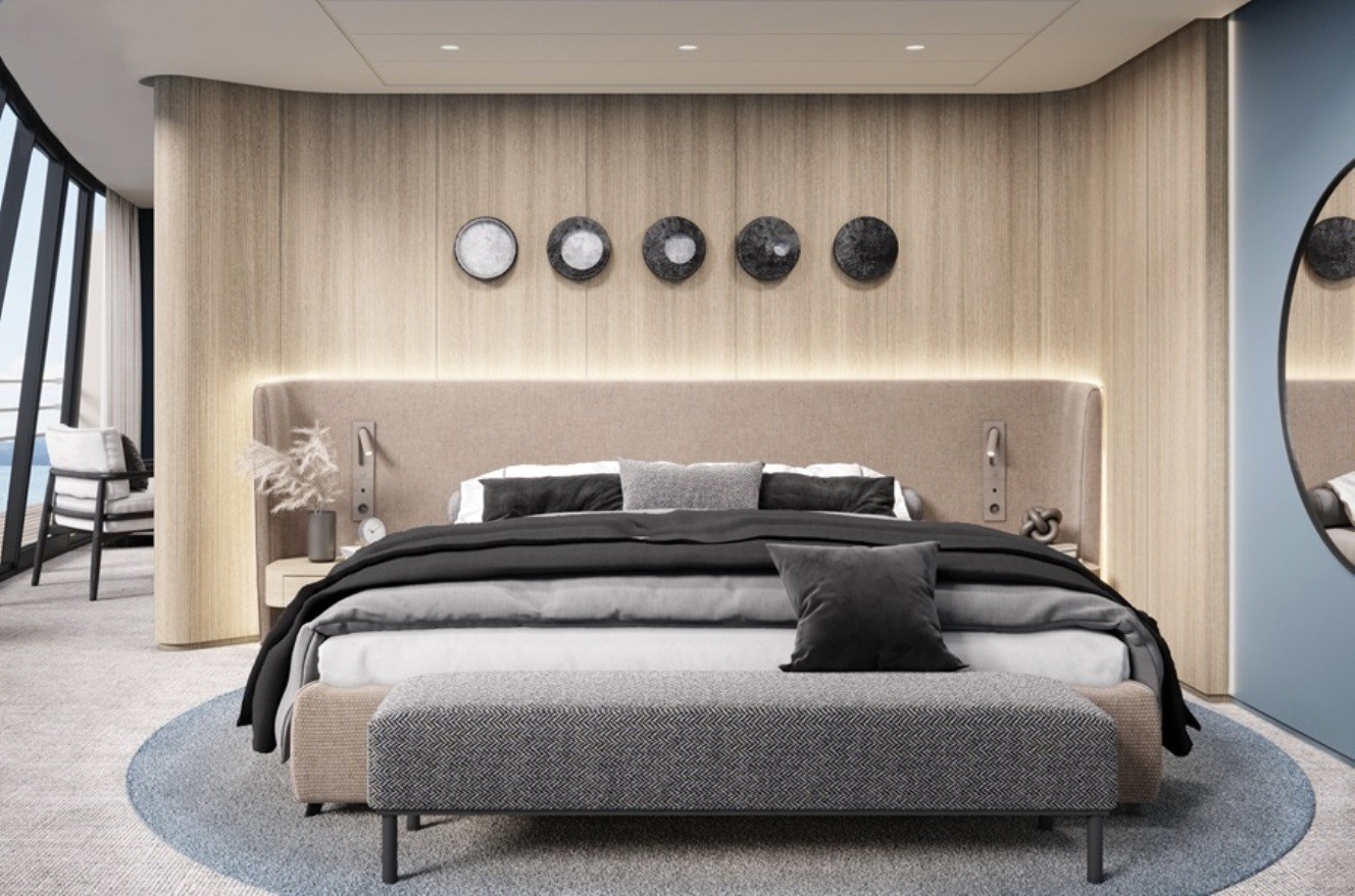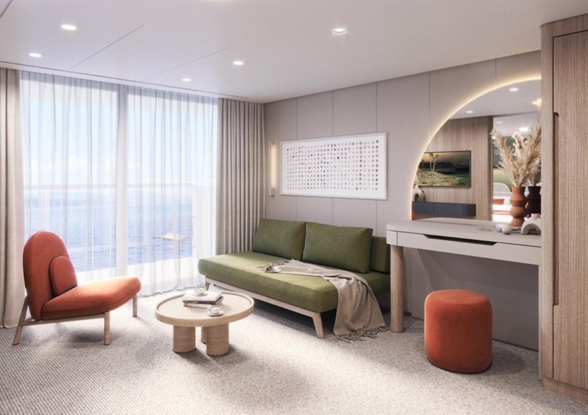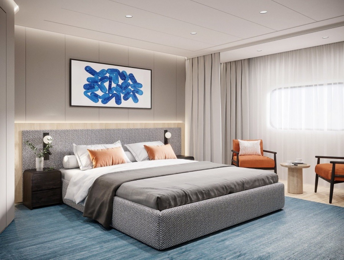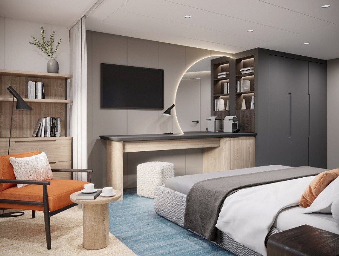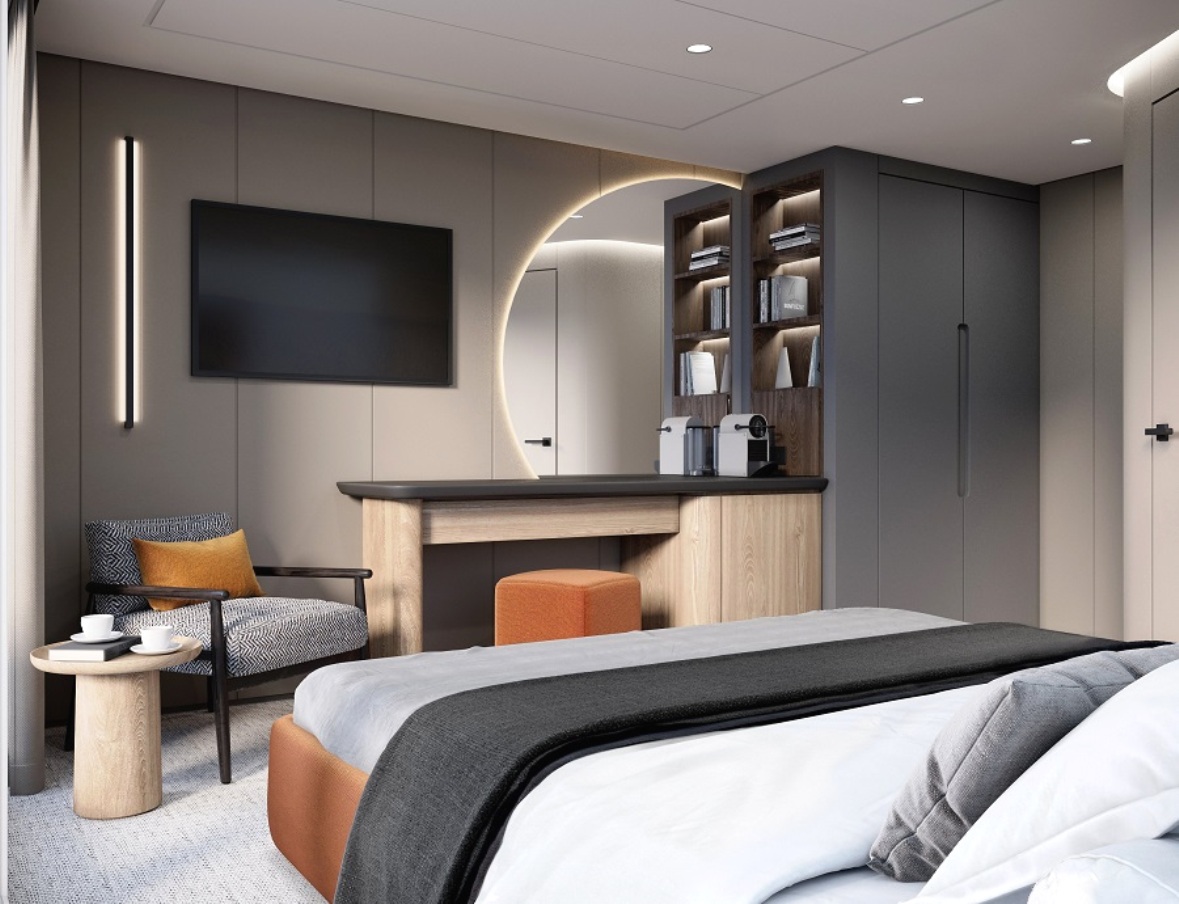 В каютах: двуспальная кровать, прикроватные тумбы, журнальный столик, письменный стол, диван, кресло, гардероб, шкаф для одежды, спутниковое ТВ, холодильник, кондиционер, розетки 220V, телефон, радио, фен, капсульная кофемашина, бутилированная питьевая вода, электрочайник, cейф, ванная комната (раковина, душ, туалет), гигиенический и косметический наборы (шампунь, гель, крем-мыло, кондиционер, шапочка для душа, ватные палочки и диски), махровые халаты, полотенца, тапочки, панорамное окно, персональный балкон с мебелью для отдыха.