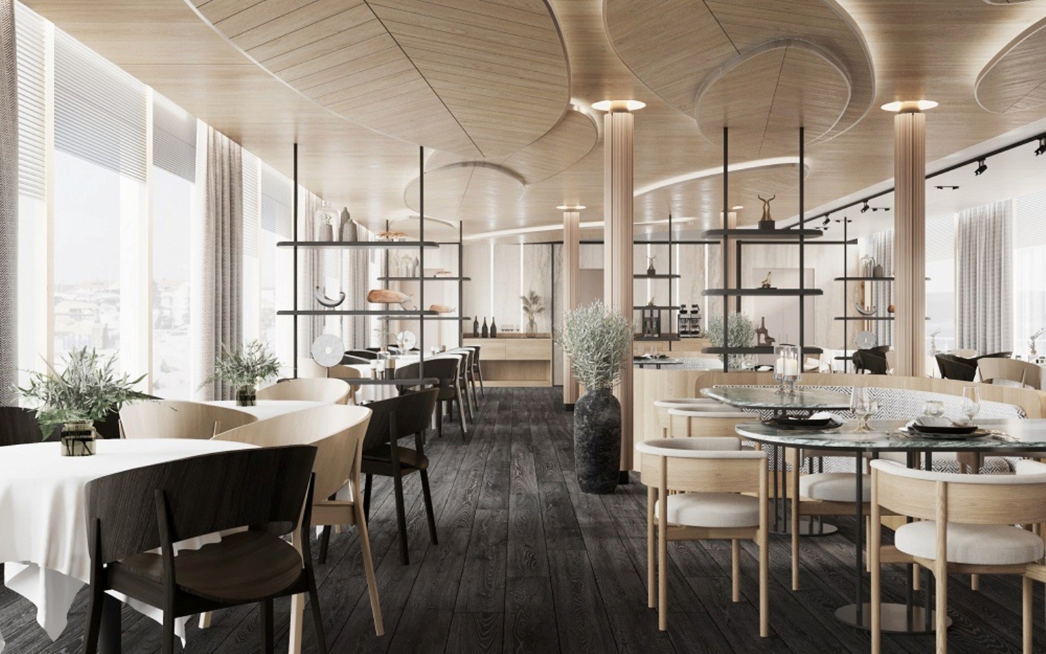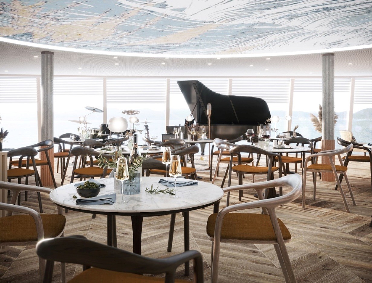 Основная зона ресторана рассчитана на 172 посадочных места, в которой благодаря панорамному остеклению открывается прекрасный вид на пейзажи за бортом. Веранда рассчитана на 24 места, где можно наслаждаться приёмом пищи и видами на свежем воздухе. В ресторане есть приватная зона на 8 мест, идеально подходит для особого случая или частного мероприятия.