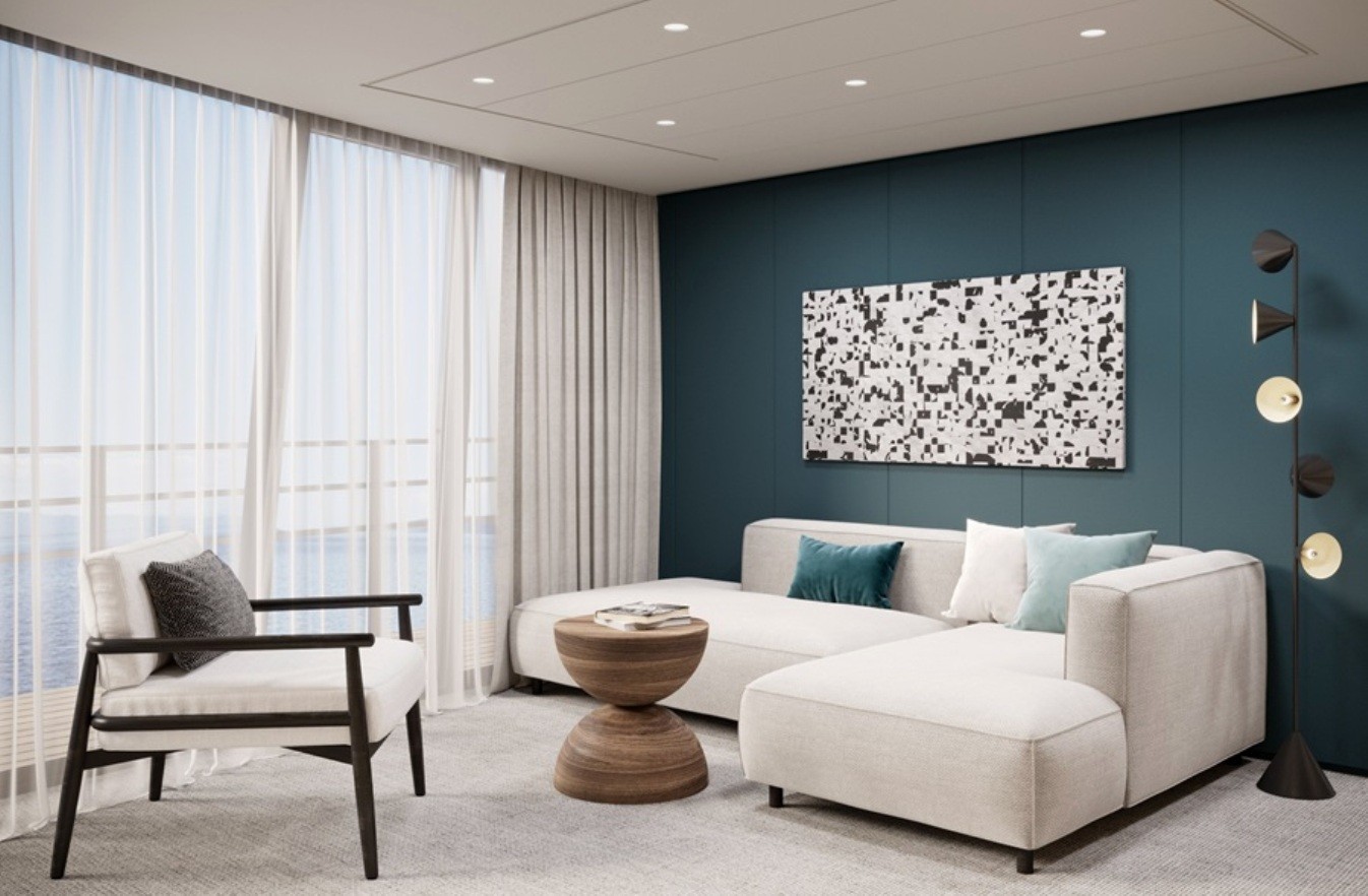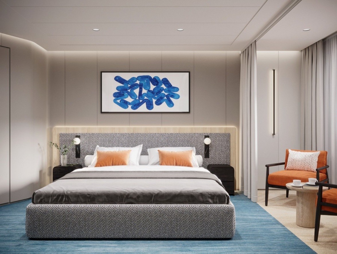 В каюте: двуспальная кровать, прикроватные тумбы, журнальный столик, письменный стол, диван, пуф, кресло, шкаф для одежды, книжный стеллаж, телевизор, спутниковое ТВ, холодильник, кондиционер, розетки 220V, телефон, радио, фен, капсульная кофемашина, бутилированная питьевая вода, электрочайник, сейф, ванная комната (раковина, душ, туалет), гигиенический и косметический наборы (шампунь, гель, крем-мыло, кондиционер, шапочка для душа, ватные палочки и диски), махровые халаты, полотенца, тапочки, персональный балкон с мебелью для отдыха.