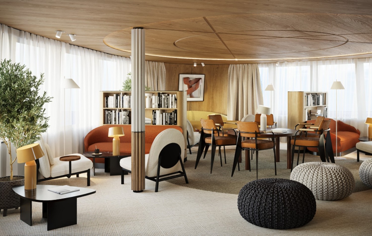 В Панорамном баре в корме шлюпочной палубы можно послушать музыкальные сеты или насладиться вкусным коктейлем. Здесь темные оттенки в сочетании с теплыми натуральными материалами создают особое настроение, а приглушенный свет помогает сделать атмосферу более расслабленной. У бара есть открытая терраса на 20 посадочных мест, которая позволит гостям продолжать музыкальный вечер на свежем воздухе - на площадке в корме за баром.