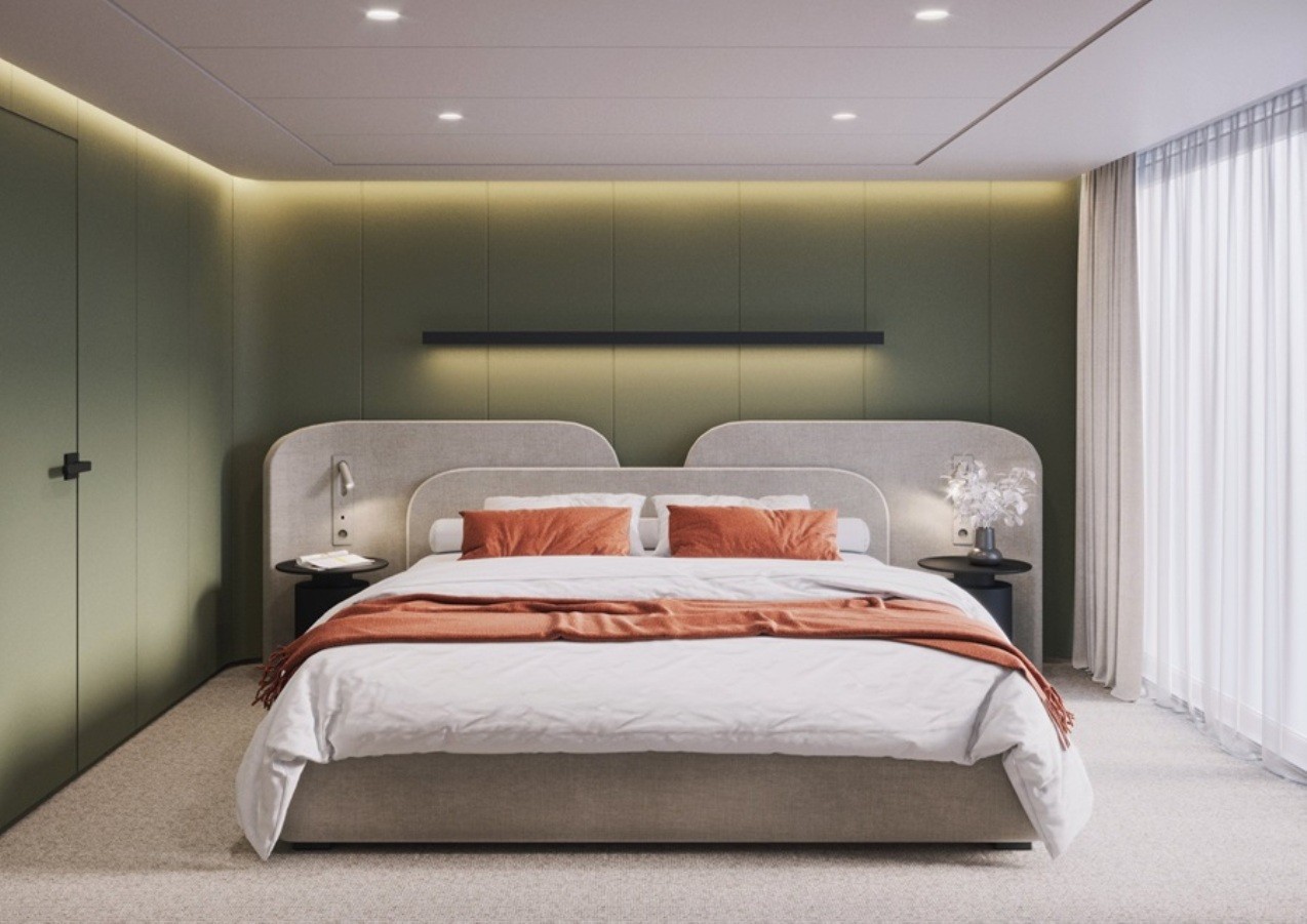 Каждая каюта оборудована межкомнатной звукоизоляционной дверью и оснащен качественной функциональной мебелью и современной бытовой техникой.