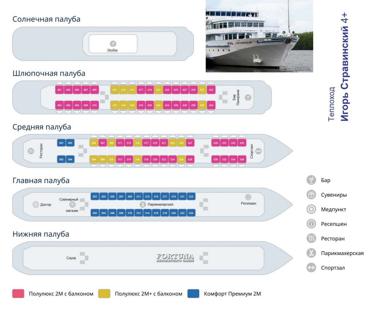 Каюты и услуги на теплоходе "Игорь Стравинский":