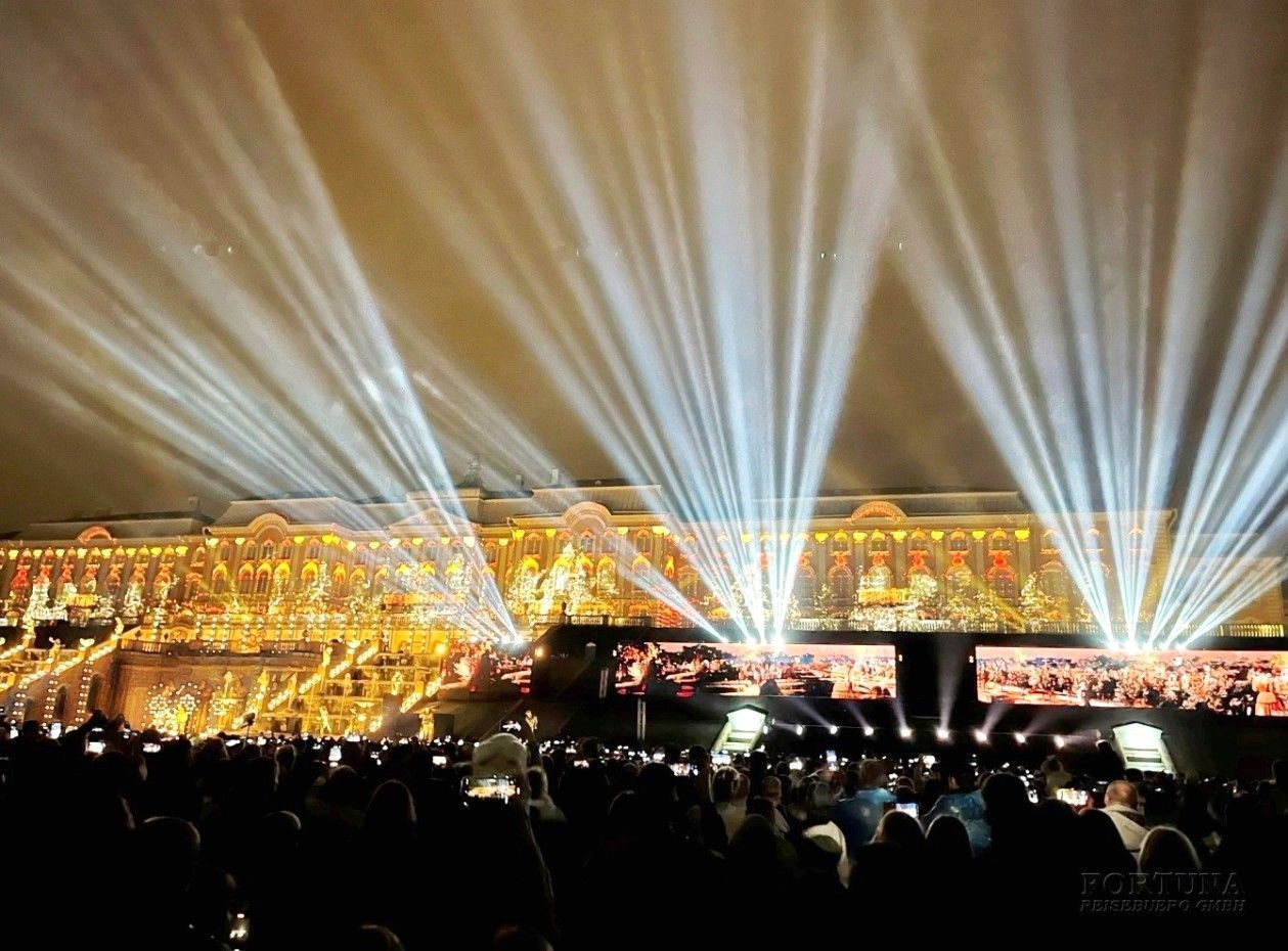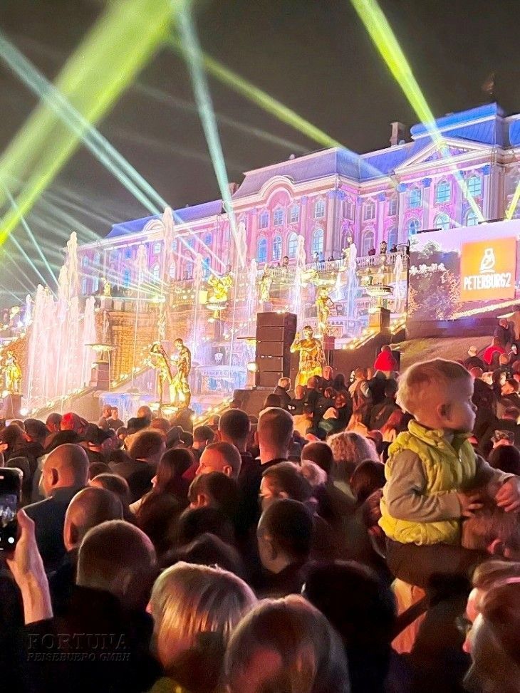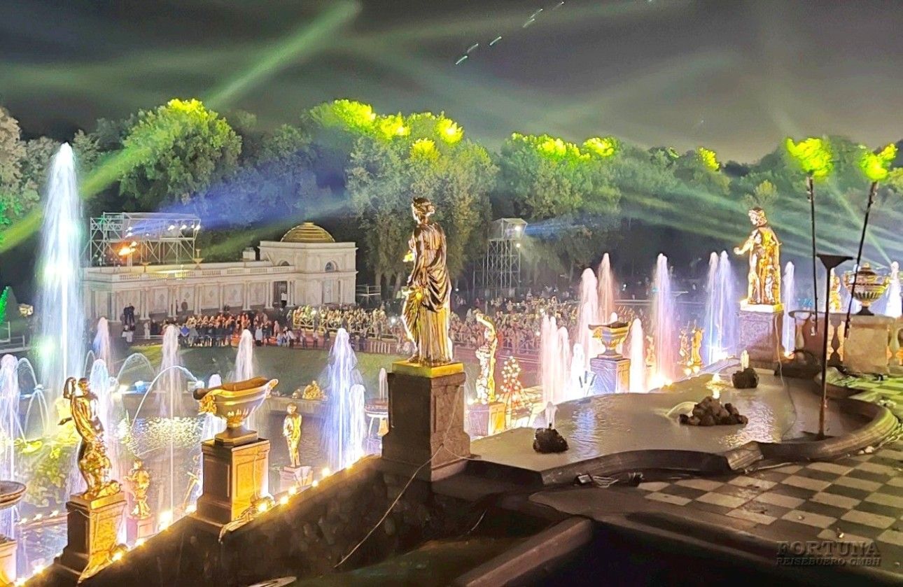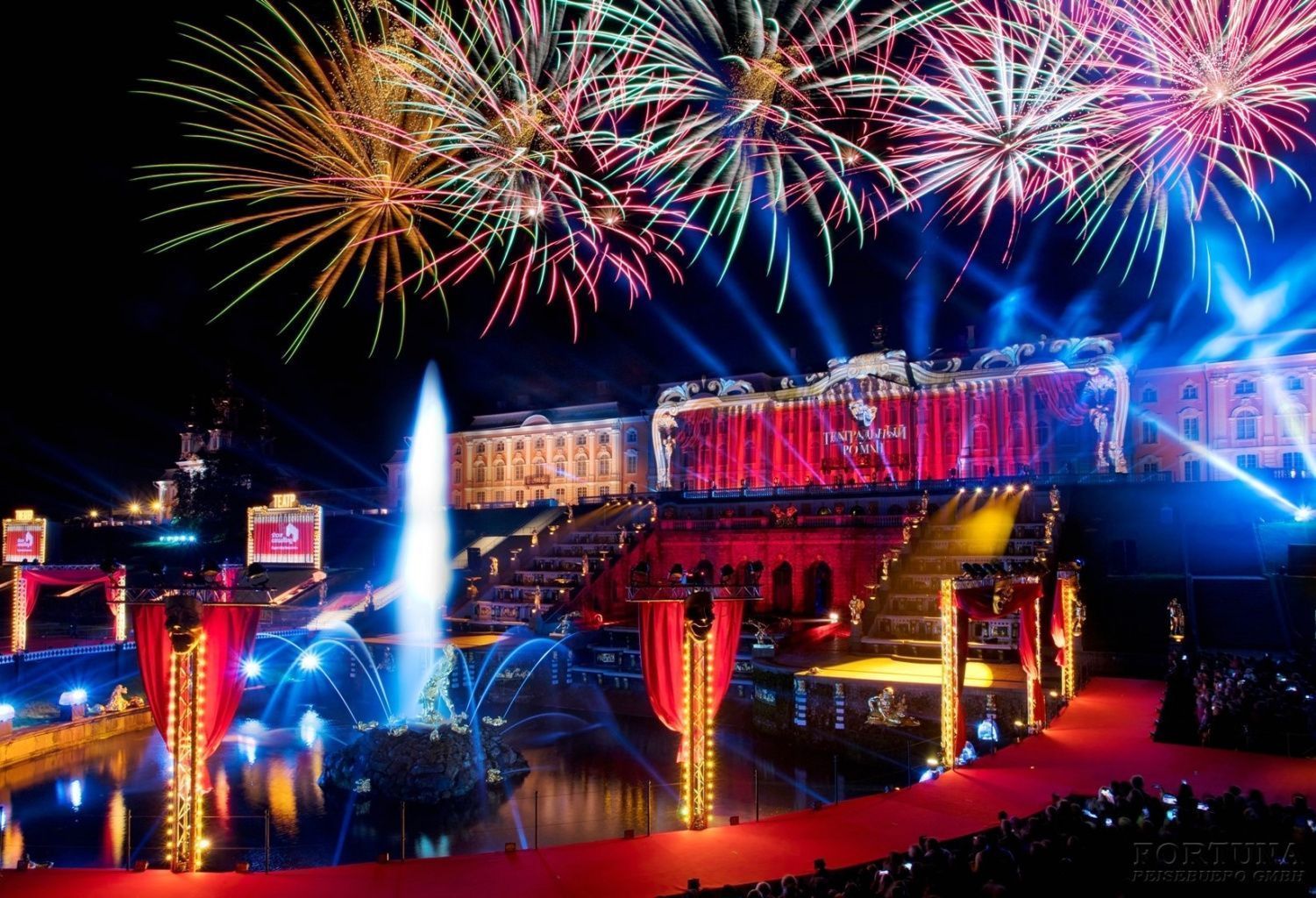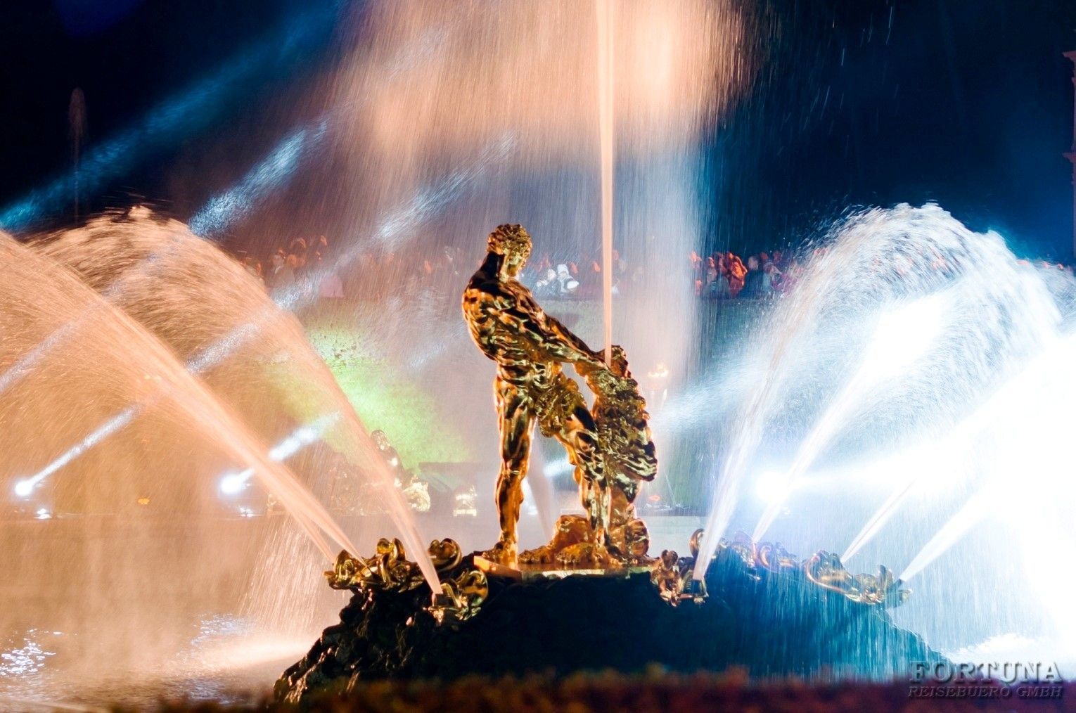 20:30 – 21:45 Торжественный праздник закрытия фонтанов, за красоту дворцово-паркового комплекса и фонтанов называемым "Русским Версалем". Театрализованное представление на Большом каскаде, пиротехническое шоу в свете разноцветных лазеров и прожекторов, огненные реки и фантастический сказочный фейерверк! Возвращение в Петербург.