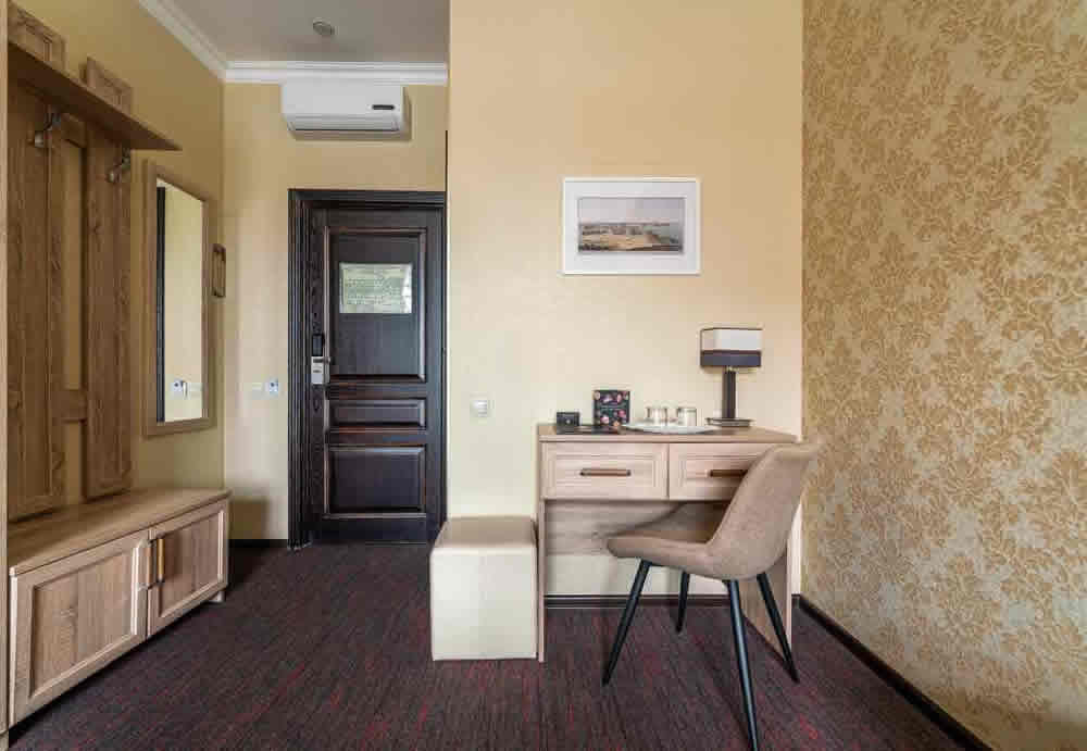 Номера данной категории оформлены в фисташковых или золотисто-терракотовых тонах и оснащены всем необходимым для комфортного и уютного пребывания. В номерах удобные современные кровати (в одноместных номерах – односпальная кровать шириной 90 см, в двухместных – две раздельные кровати с возможностью трансформации в кровать «king size»). В номерах на солнечной стороне установлены кондиционеры воздуха с индивидуальным управлением.
