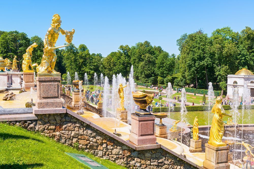 Петергоф - город фонтанов. Первые фонтаны были открыты здесь ещё при Петре Первом и, по замыслу царя, работают за счет естественных перепадов уровня воды. В Петергофе никогда не использовались насосы, благодаря многочисленным родникам Ропшинских высот водой обеспечиваются все Петергофские фонтаны. Разделение парков проходит по склону горы между Нижним и Верхним парками, на котором возвышается Большой Дворец с его великолепным каскадом фонтанов. Торжественное открытие дворца состоялось в 1723-м году и по своей роскоши и размаху ничуть не уступает известной резиденции французских королей – Версалю. Масштабы же фонтанной системы превосходят масштабы версальской. Петергоф неизменно ассоциируется с фонтанами - итогом долгой и кропотливой работы стало появление пяти каскадов и более 150 фонтанов.