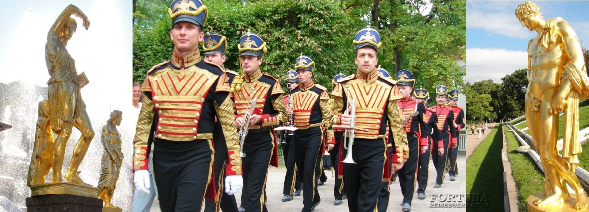 На террасах Большого Каскада перед Большим Петергофским дворцом под музыку разворачивается завораживающее праздничное действие. Взлетающие вверх водные струи из 64 роскошных фонтанов в освещении разноцветного фейерверка переливаются во множестве декоративных деталей и 255 бронзовых позолоченных скульптур. Самое крупное фонтанное сооружение мира превзошло знаменитый Версальский ансамбль обилием воды, инженерной конструкцией фонтанов и богатством архитектурно-декоративных деталей.