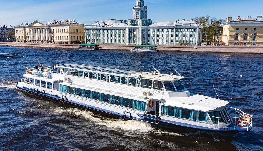 Двухпалубный теплоход-ресторан с открытой прогулочной площадкой под открытым небом на верхней палубе. Круиз по парадной Неве и ресторанное обслуживание по меню. Предварительный выбор мест и бокал шампанского в подарок каждому гостю.