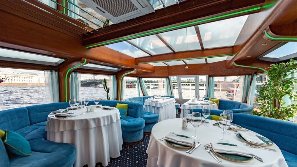 Двухпалубный теплоход-ресторан с открытой прогулочной палубой. Круиз по Неве с ресторанным обслуживанием по меню. Изысканные блюда, живая музыка, предварительный выбор мест. Бокал шампанского в подарок каждому гостю.