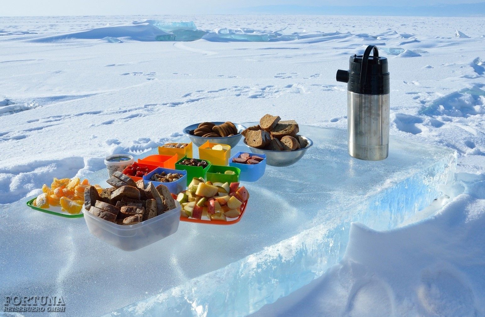 Возвращаемся с мыса, и нас ждет уже горячий обед-пикник на свежем морозном воздухе.