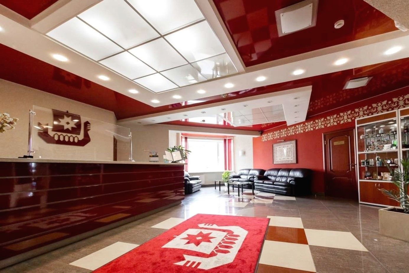 Интерьеры отеля «Онежский замок» вдохновлены древними рисунками народов Карелии, а в уютных номерах постелен деревянный пол, интерьер выполнен в теплом красном и белом тонах.