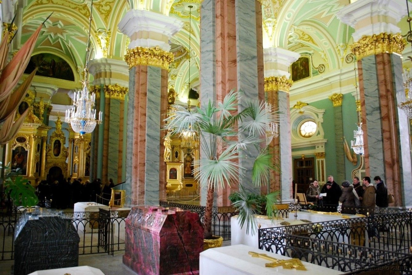 Параллельно с крепостью Петр I распорядился строить и деревянную церковь, а в 1712 было начато возведение каменного храма. В 1731 он был переименован в собор во имя первоверховных апостолов Петра и Павла, который стал усыпальницей Романовых, поэтому действующие императоры и императрицы перед отъездом из города посещали собор, чтобы попросить благословения у родителей. Петропавловский собор входит в ансамбль крепости и составляет ее изюминку. Достопримечательностью собора является высокая колокольня со смотровой площадкой. Венчает колокольню шпиль с крестом и фигурой парящего ангела. Во время царствования Екатерины II от молнии, ударившей в шпиль, загорелся собор. И после ремонта было принято решение конструкцию дополнить громоотводом. В XIX в. деревянные крепежные конструкции заменили на металлические из-за ветхости, и высота собора прибавила 16 м, составив целых 122,5 м. Таким образом собор стал самым высоким зданием Санкт-Петербурга. Также на башне установлены куранты, которые полюбились императору Петру I еще во время заграничных поездок. В целом весь Петропавловский собор создавался под веянием архитектуры Италии и севера Европы. В плане сооружение прямоугольной формы, увенчанное всего одним куполом. Экстерьер собора очень скромен, а интерьер, напротив, поражает своей помпезностью.