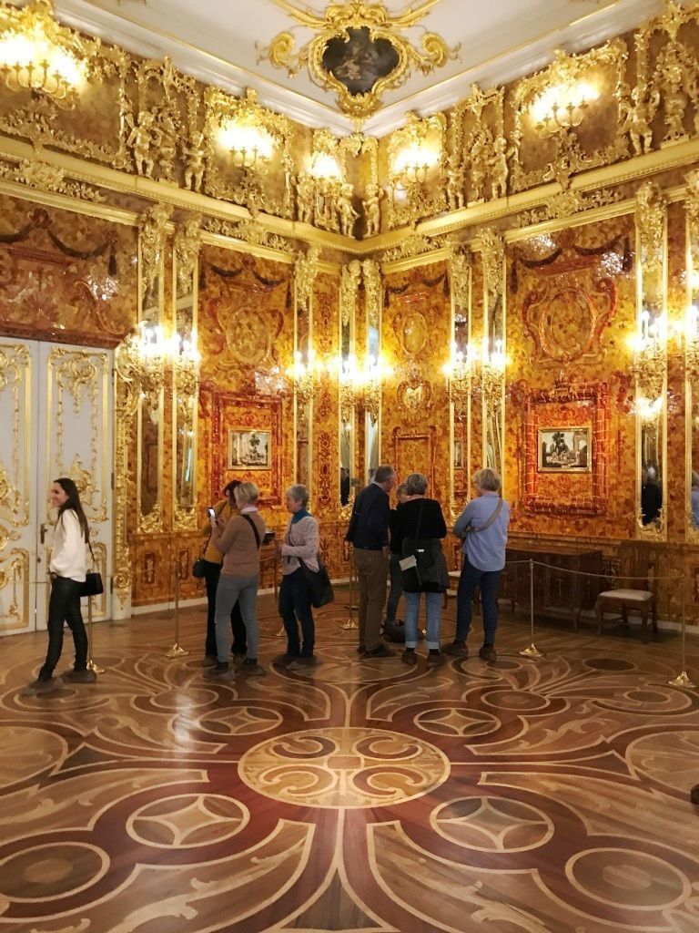 Фасад лазоревого цвета чудесно гармонирует с золочеными элементами декора. Северную сторону венчают золотые купола дворцовой церкви, а к южной примыкает великолепное парадное крыльцо. Главный зал дворца – самый большой во всех дворцах Петербурга, его потолки с величественным плафоном достигают около 47 м в высоту. Прогуливаясь по знаменитой Парадной анфиладе с огромными окнами, вы сможете увидеть множество прекрасных комнат, отдельного упоминания среди которых заслуживает всемирно известная Янтарная.