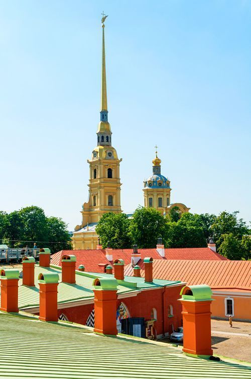 Параллельно с крепостью Петр I распорядился строить и деревянную церковь, а в 1712 было начато возведение каменного храма. В 1731 он был переименован в собор во имя первоверховных апостолов Петра и Павла, который стал усыпальницей Романовых, поэтому действующие императоры и императрицы перед отъездом из города посещали собор, чтобы попросить благословения у родителей. Петропавловский собор входит в ансамбль крепости и составляет ее изюминку. Достопримечательностью собора является высокая колокольня со смотровой площадкой. Венчает колокольню шпиль с крестом и фигурой парящего ангела. Во время царствования Екатерины II от молнии, ударившей в шпиль, загорелся собор. И после ремонта было принято решение конструкцию дополнить громоотводом. В XIX в. деревянные крепежные конструкции заменили на металлические из-за ветхости, и высота собора прибавила 16 м, составив целых 122,5 м. Таким образом собор стал самым высоким зданием Санкт-Петербурга. Также на башне установлены куранты, которые полюбились императору Петру I еще во время заграничных поездок. В целом весь Петропавловский собор создавался под веянием архитектуры Италии и севера Европы. В плане сооружение прямоугольной формы, увенчанное всего одним куполом. Экстерьер собора очень скромен, а интерьер, напротив, поражает своей помпезностью.