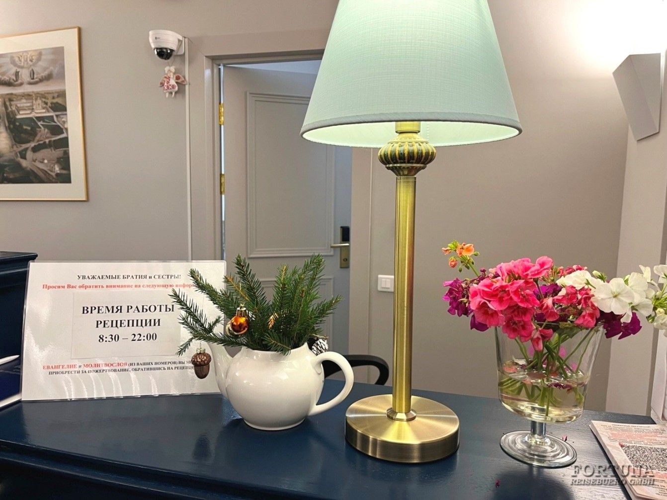 На стойке ресепшен можно получить всю необходимую информацию. К услугам гостей острова Валаам в здании бывшей Женской трапезной обустроены два обеденных зала с кухней, отвечающей всем современным требованиям.