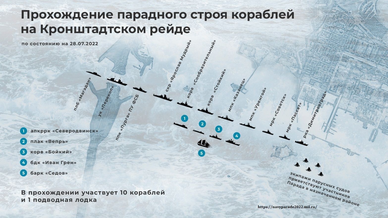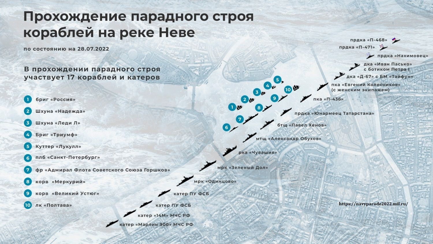 В 12:00 все корабли, которые будут участвовать в параде, пришвартуются на Английской набережной, чтобы все желающие могли подняться на борт боевых кораблей.
