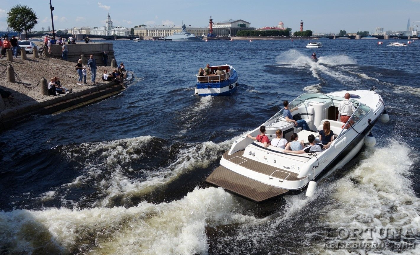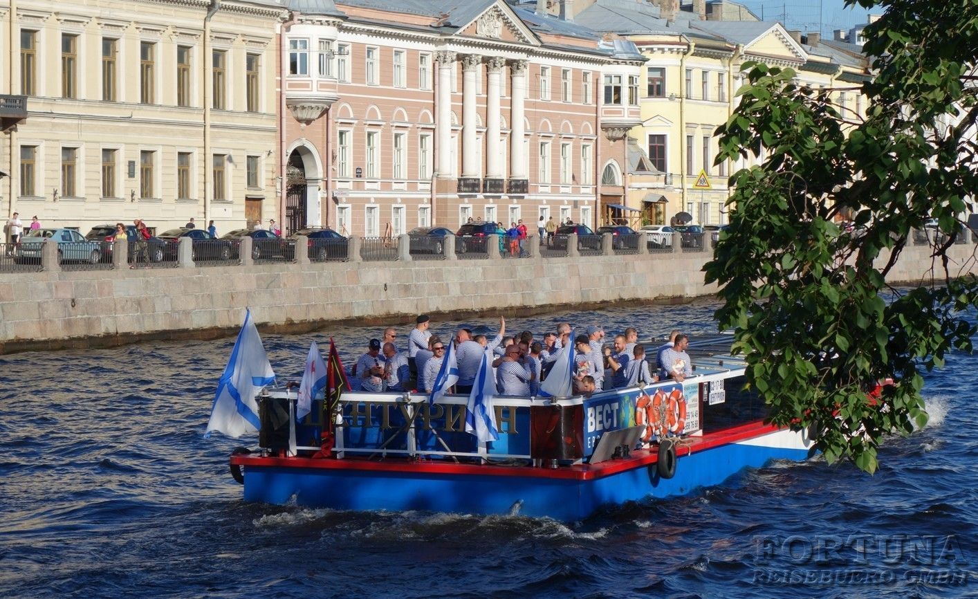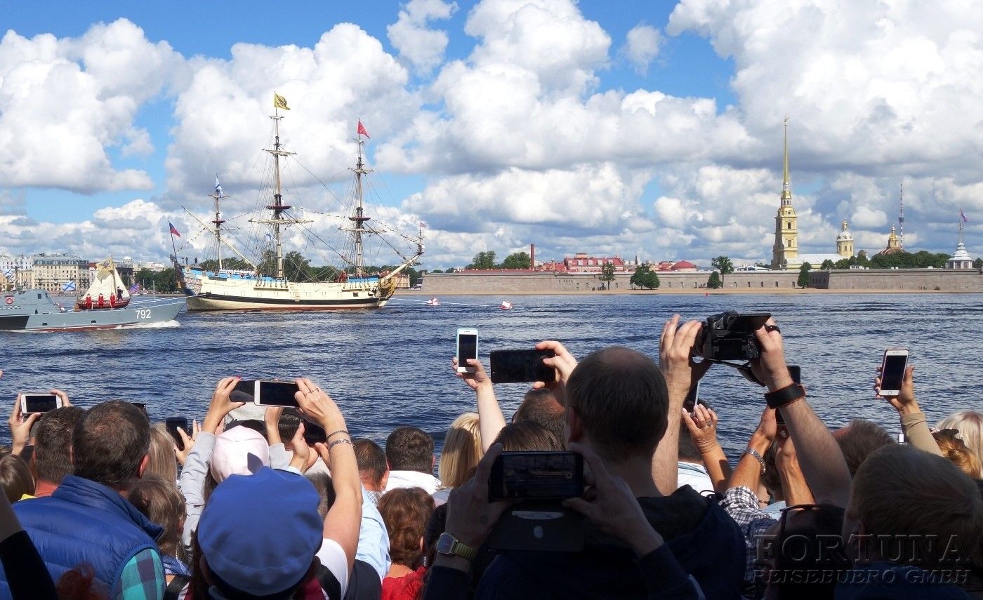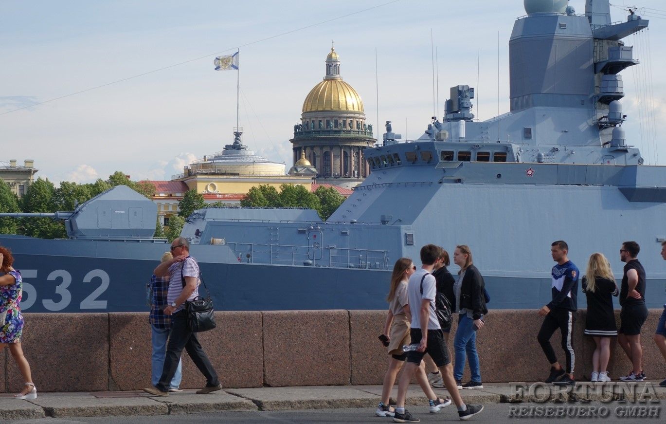 Либо Вы можете приобрести дополнительную водную экскурсию по Неве, и с борта двухпалубного теплохода, имеющего открытую и закрытую палубы на случай непогоды, любоваться парадом кораблей стоящих вдоль набережных. Оттуда вам откроется замечательный вид на Неву, боевые корабли, а также уже знакомые вам достопримечательности. Санкт-Петербург знаменит своими многочисленными каналами и реками, с водной глади которых вы вновь полюбуетесь красивейшим городом России, и откроете для себя его новые и необычные виды. Опытные гиды поделятся с вами необычными фактами о богатой истории российского флота. Это незабываемая экскурсия для каждого гостя города на Неве!
