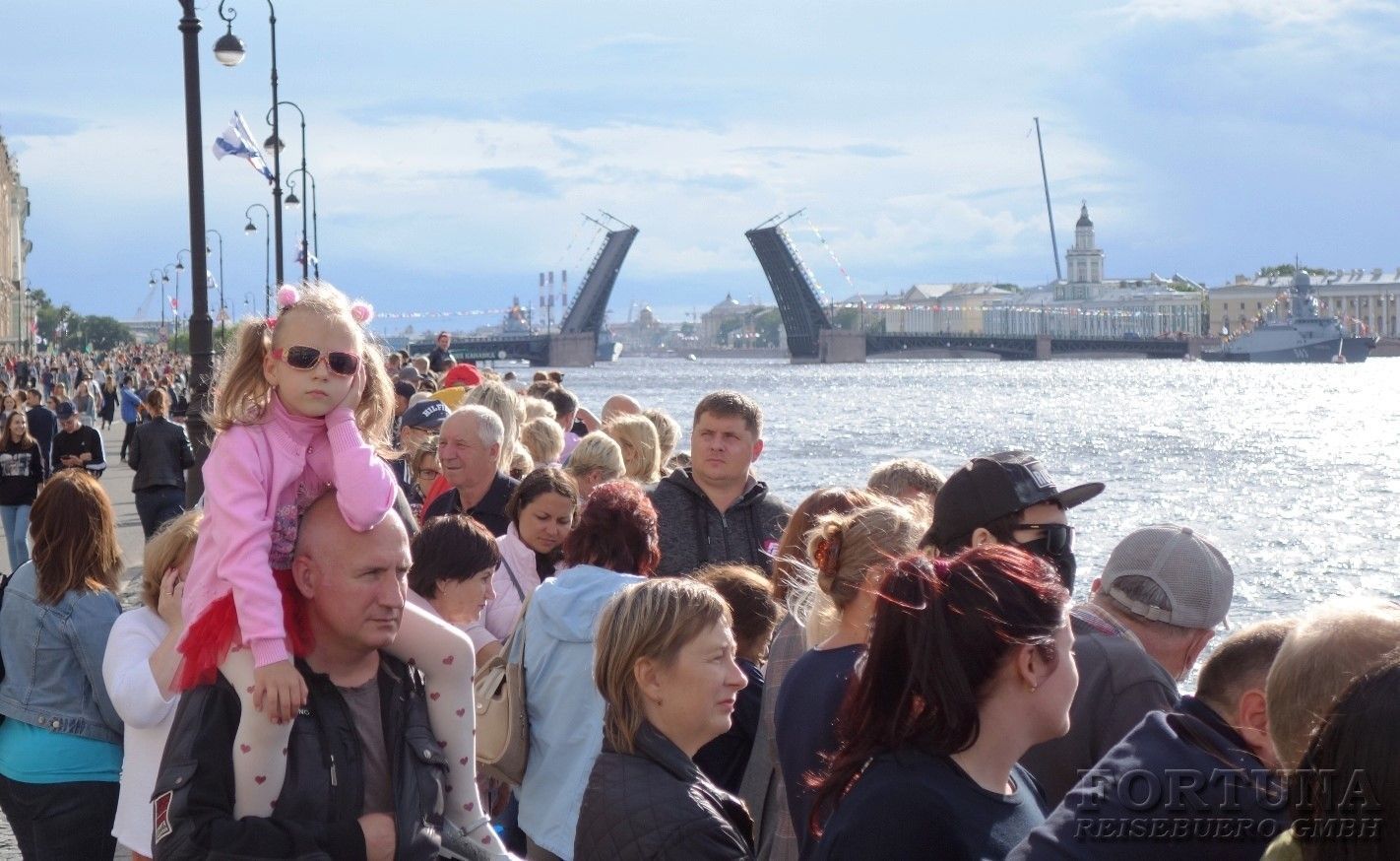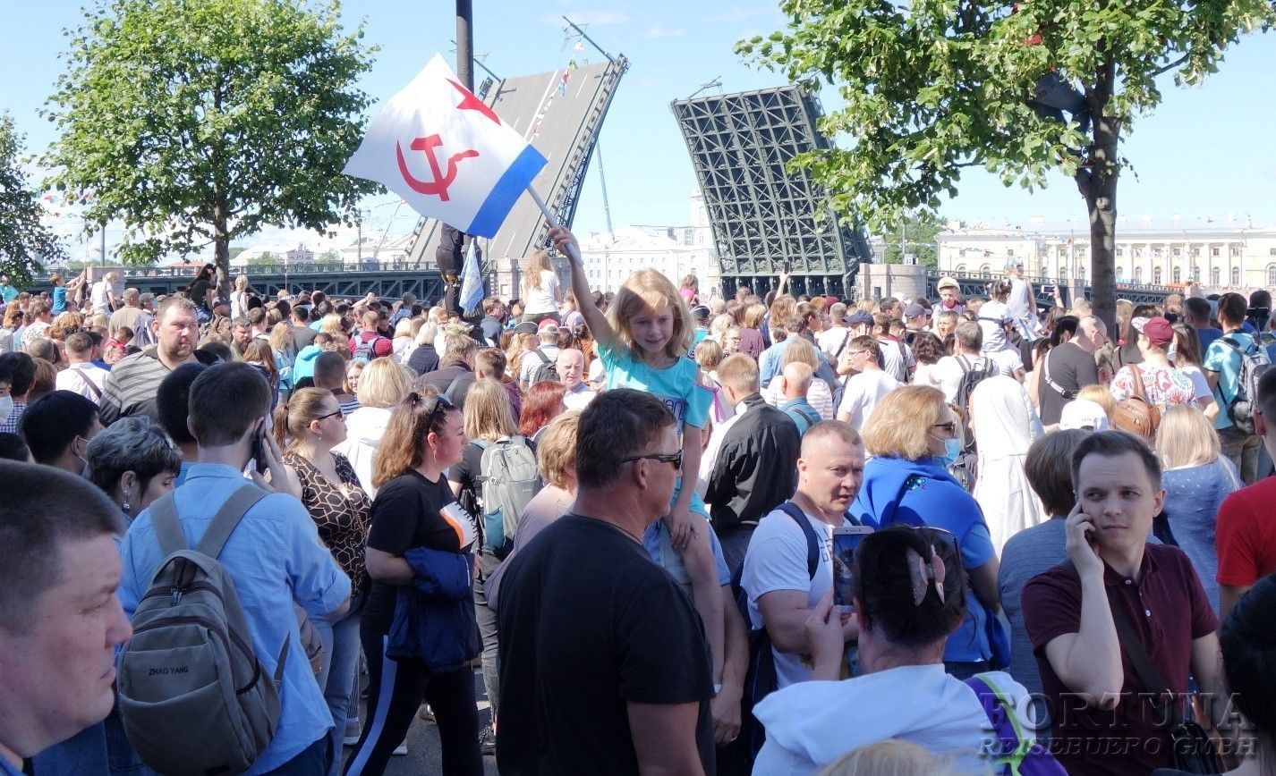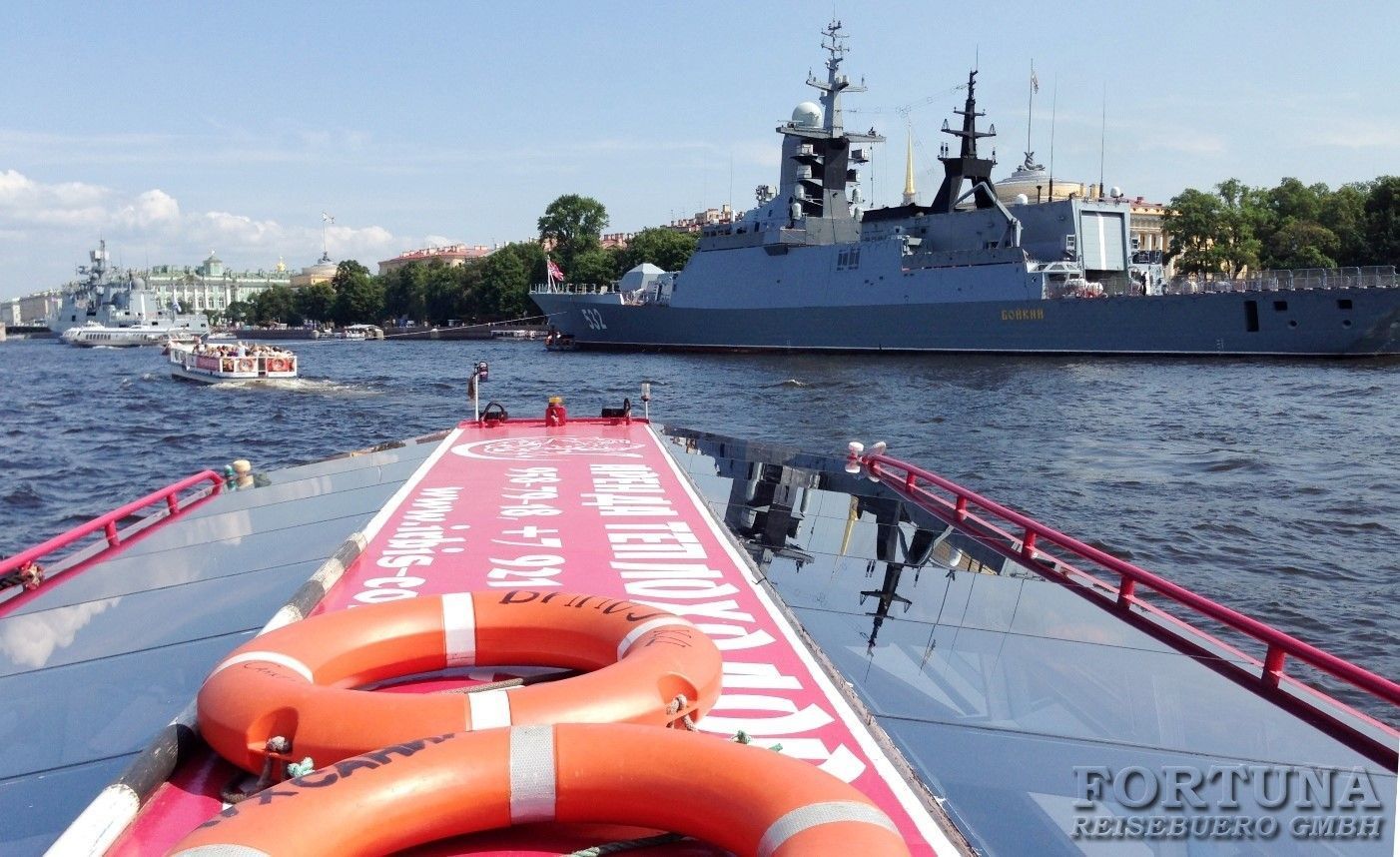 Либо Вы можете приобрести дополнительную водную экскурсию по Неве, и с борта двухпалубного теплохода, имеющего открытую и закрытую палубы на случай непогоды, любоваться парадом кораблей стоящих вдоль набережных. Оттуда вам откроется замечательный вид на Неву, боевые корабли, а также уже знакомые вам достопримечательности. Санкт-Петербург знаменит своими многочисленными каналами и реками, с водной глади которых вы вновь полюбуетесь красивейшим городом России, и откроете для себя его новые и необычные виды. Опытные гиды поделятся с вами необычными фактами о богатой истории российского флота. Это незабываемая экскурсия для каждого гостя города на Неве!
