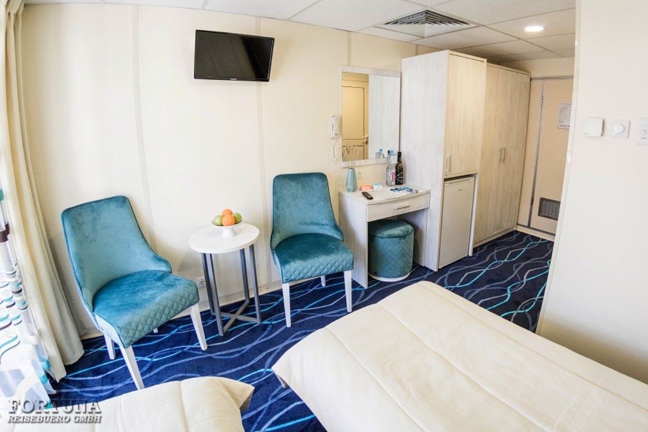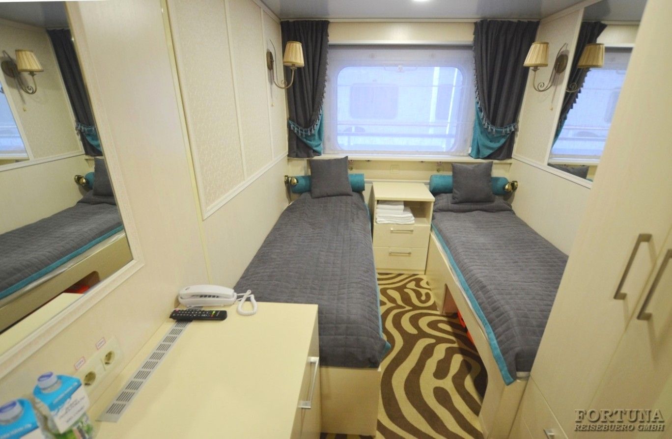В каюте: две односпальные кровати, ванная комната (раковина, душ, туалет), прикроватная тумба, шкаф, туалетный стол, пуф, вешалка для верхней одежды, холодильник, радио, телевизор с кабельным и спутниковым вещанием, телефон, фен, тапочки, набор посуды, щетка для одежды, плед для каждого туриста, розетки 220 V, система кондиционирования воздуха, обзорное окно.