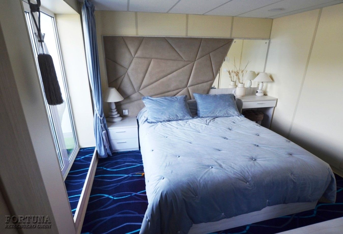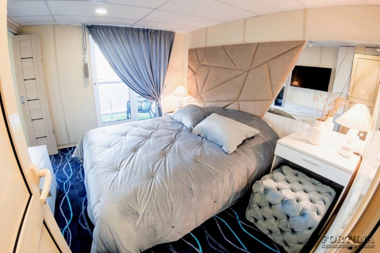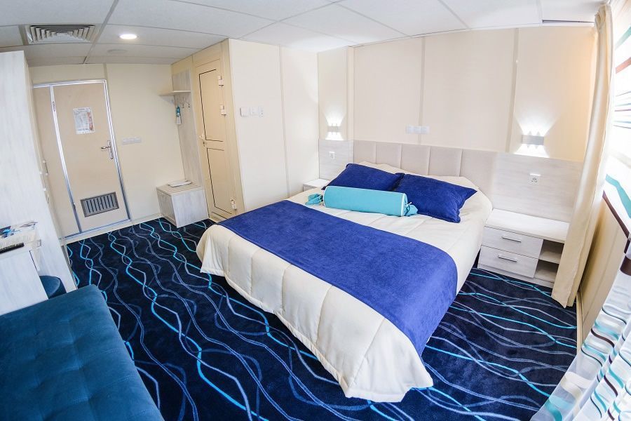 В комфортабельных каютах: панорамное окно, одна двуспальная кровать (при необходимости трансформируется в две односпальные кровати), настенные встроенные бра, 2 прикроватные тумбы, банкетка, диван (не раскладывается), стол с зеркалом, сейф, мини-холодильник, плазменный телевизор с кабельным и спутниковым вещанием, внутренний телефон, бортовое радио, розетки 220 V, wi-fi роутер. В прихожей небольшой гардероб и вместительный платяной шкаф с пеналом.