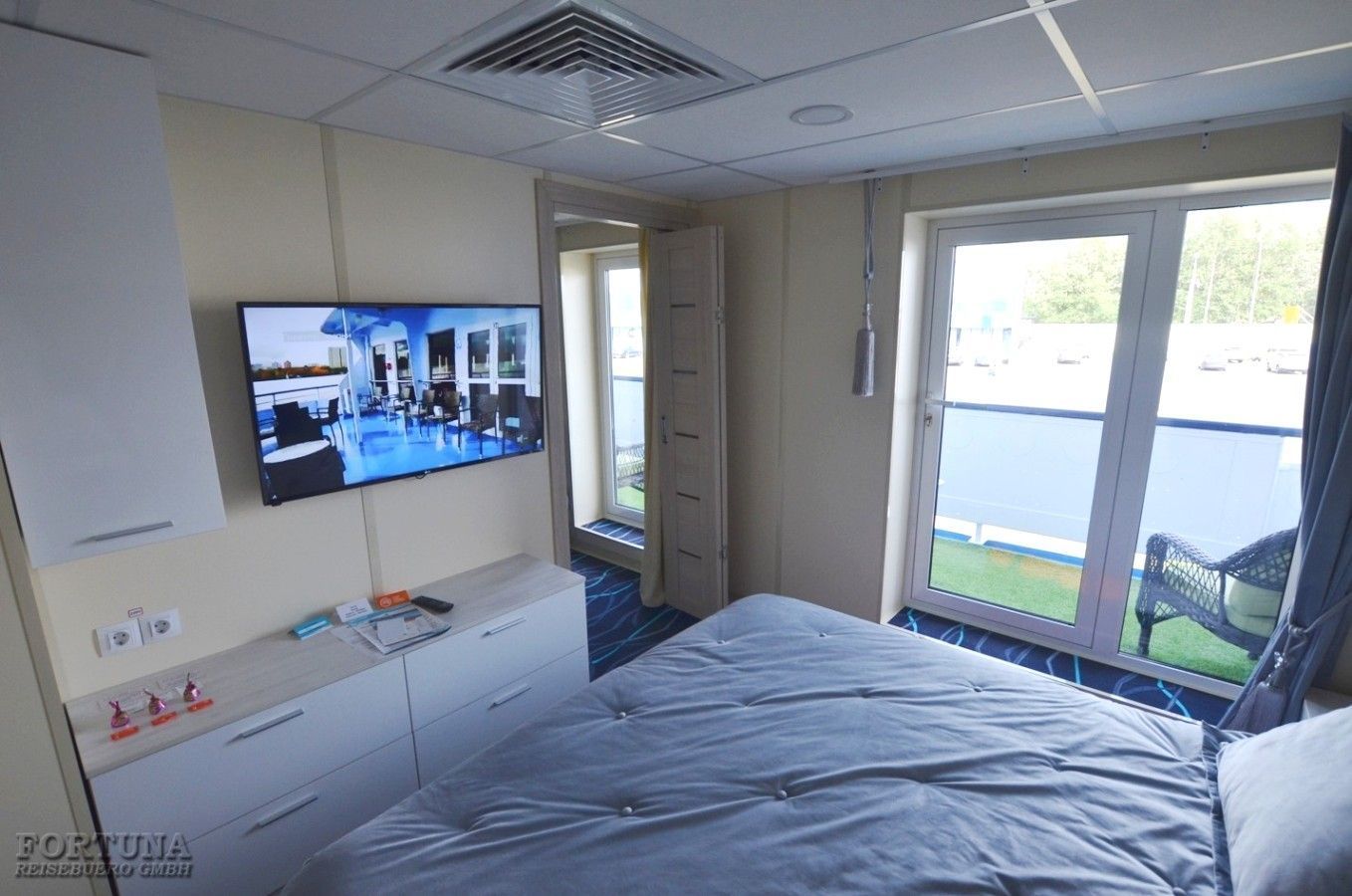 В каюте: одна двуспальная кровать (при необходимости трансформируется в две односпальные кровати), ванная комната (раковина, душевая кабина, туалет), два кресла, прикроватные тумбы, шкаф, вешалка для верхней одежды, туалетный стол, пуф, холодильник, кондиционер, радио, сейф, фен, wi-fi роутер, плед для каждого туриста, телевизор с кабельным и спутниковым вещанием, телефон, розетки 220 V, обзорное окно, стеклянная балконная дверь, персональный балкон с мебелью для отдыха.