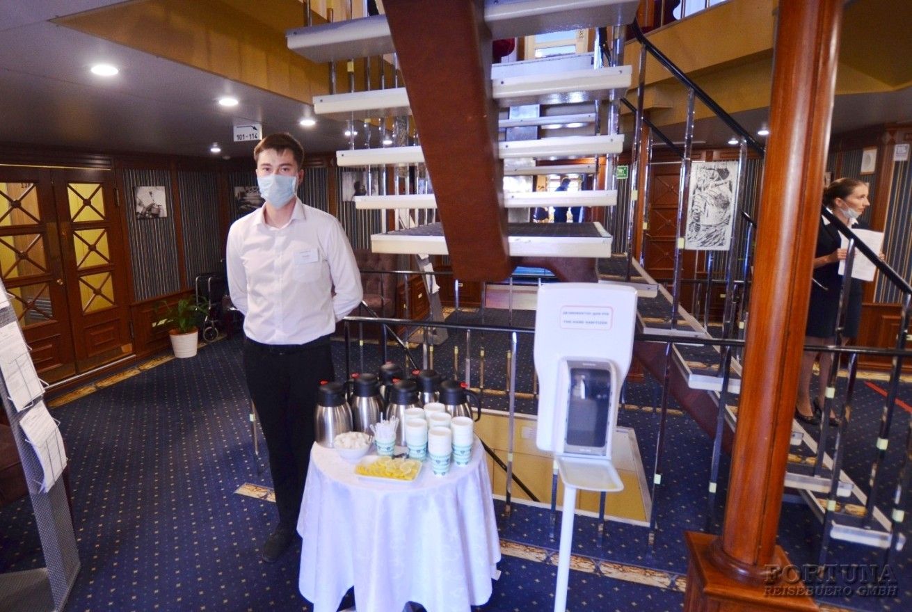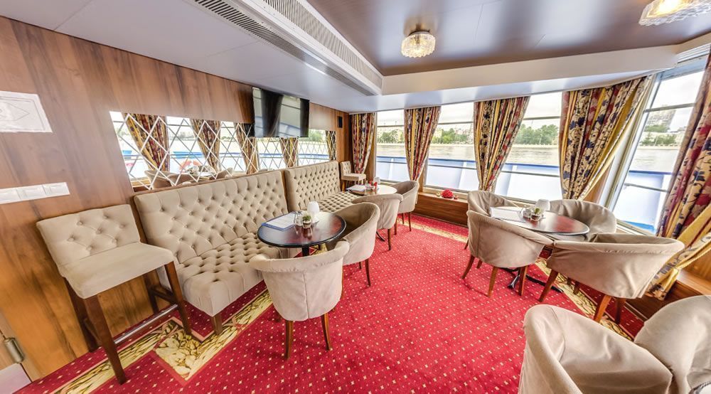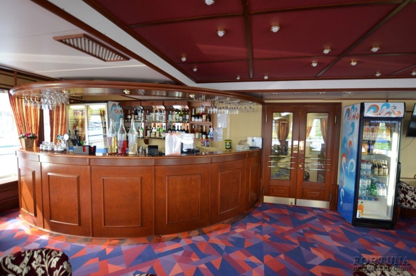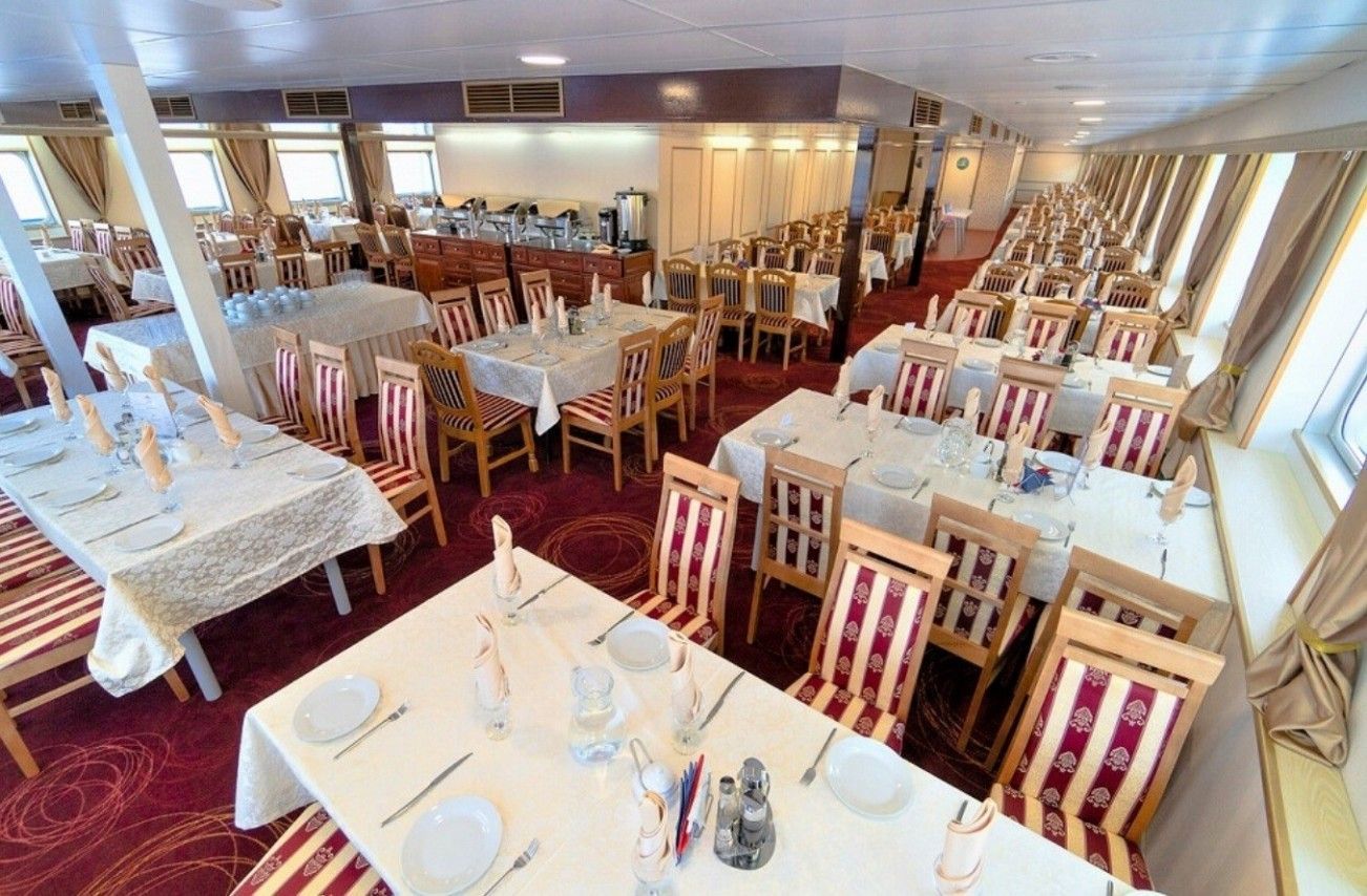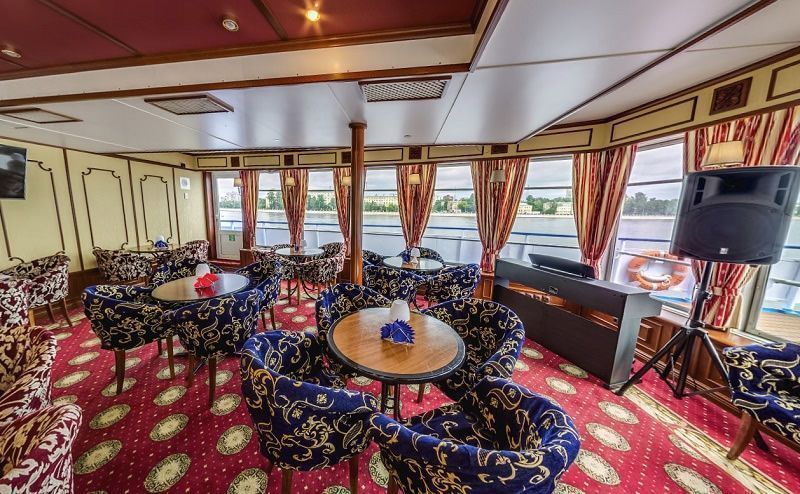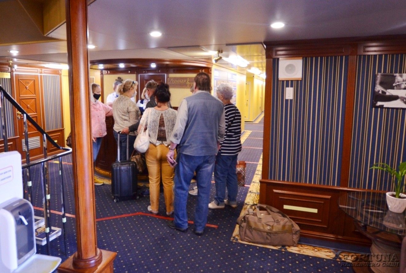 На борту комфортабельного теплохода, ранее работавшего с иностранными туристами, имеется просторный вестибюль со стойкой ресепшен. Приветливый администратор поможет вам с регистрацией на борту и доставкой багажа до забронированной каюты. На ресепшене вам выдадут ключи от каюты и экскурсионную программу круиза - наземные экскурсии можно будет выбрать согласно речному маршруту. Дополнительно вы получите специальные "кредитные карты", которыми можно будет расплатиться за дополнительные экскурсии, в баре и сувенирном киоске теплохода. Что очень удобно - нет надобности с собой на теплоходе носить деньги - все траты записываются на карту, а в конце круиза происходит взаиморасчет и оплата доп. услуг. Правила и условия узнавайте, пожалуйста, при регистрации на рейс на теплоходе.