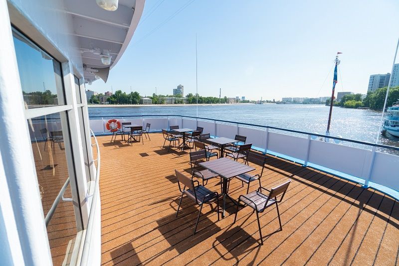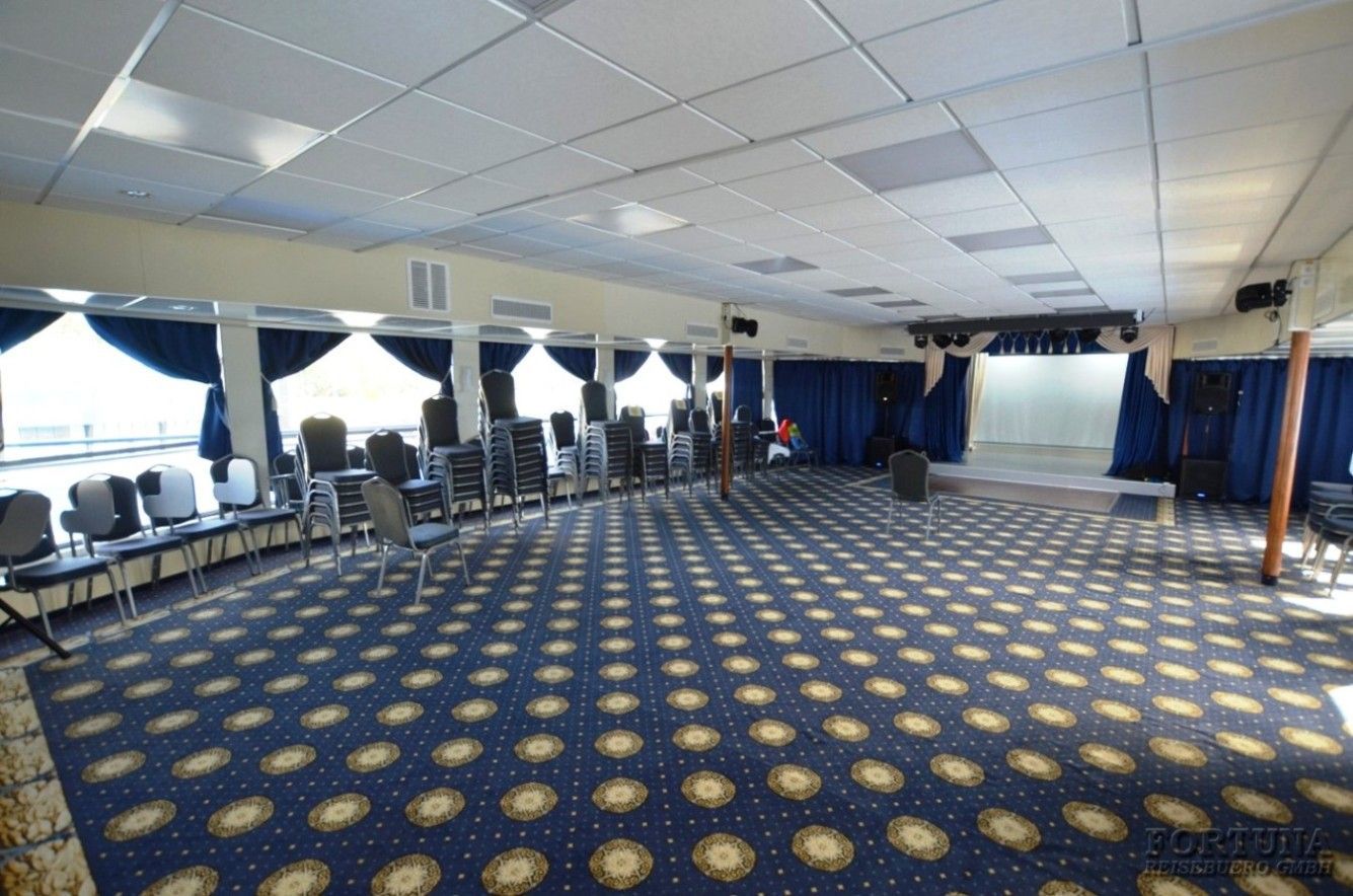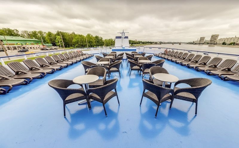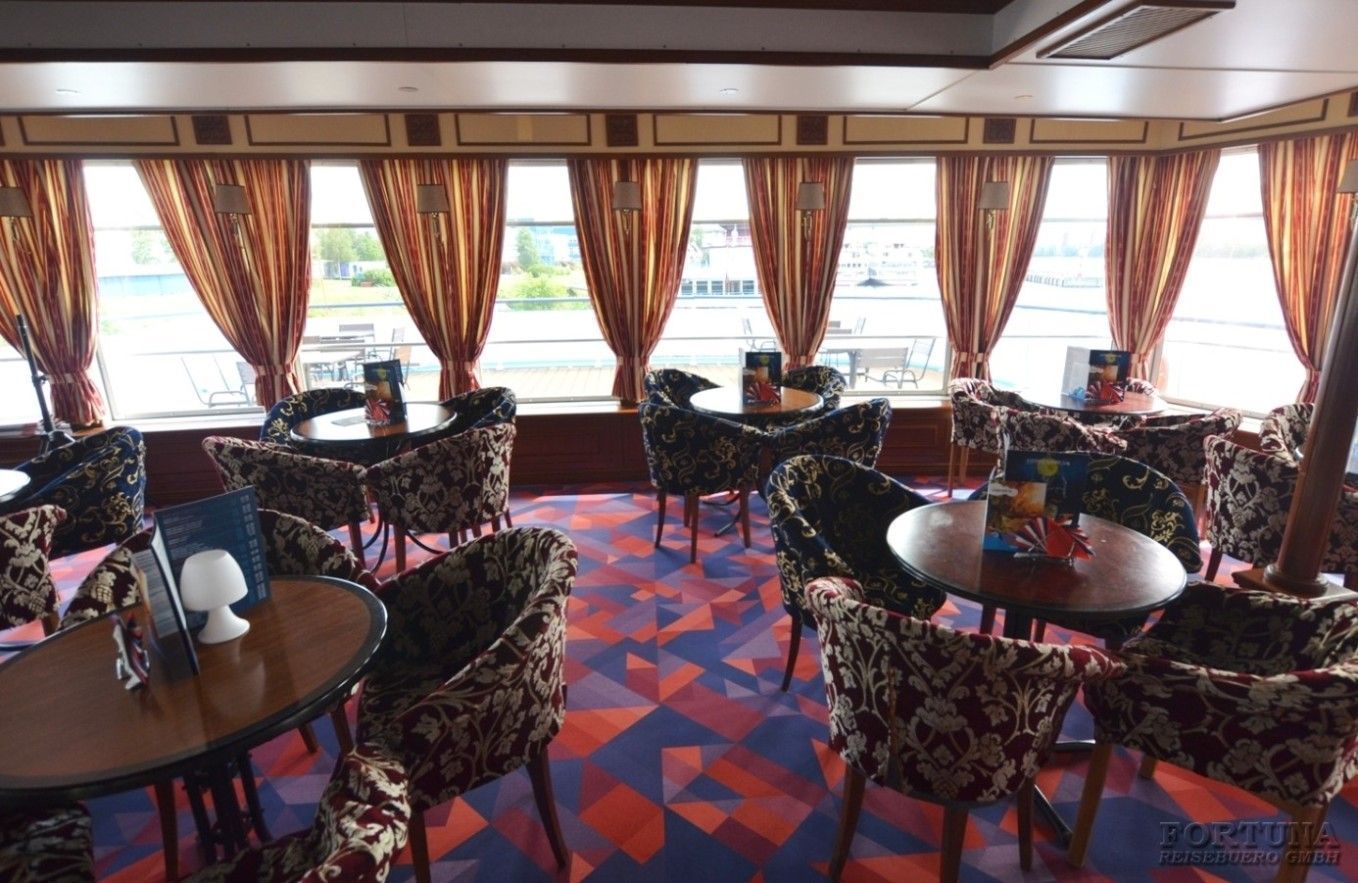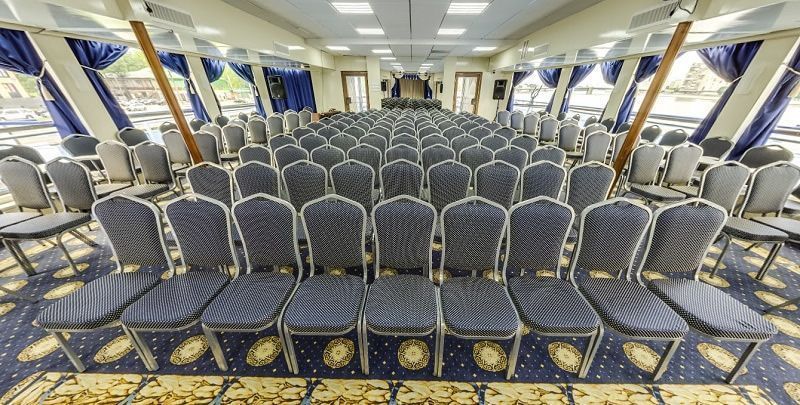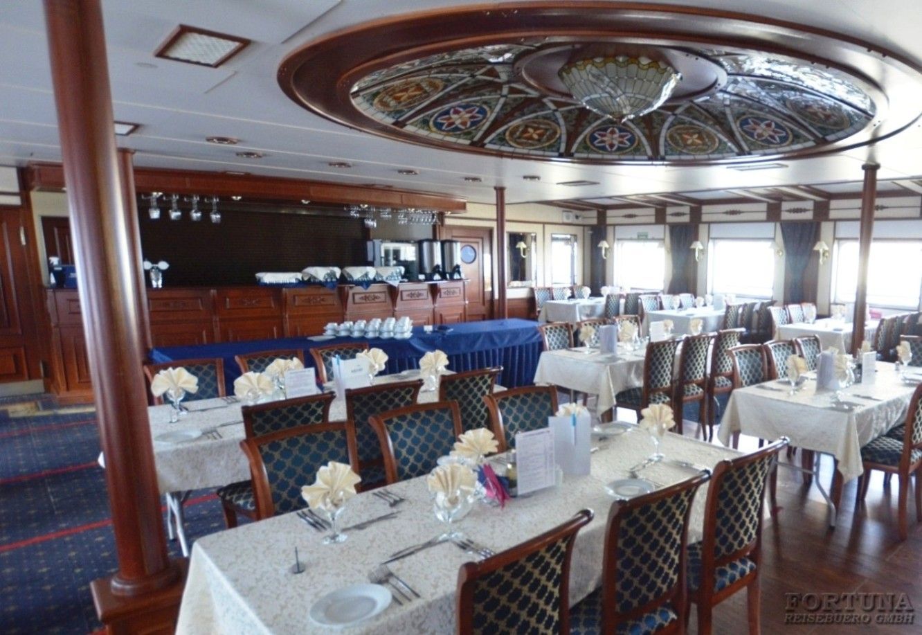 На борту комфортабельного теплохода, ранее работавшего с иностранными туристами, имеется просторный вестибюль со стойкой ресепшен. Приветливый администратор поможет вам с регистрацией на борту и доставкой багажа до забронированной каюты. На ресепшене вам выдадут ключи от каюты и экскурсионную программу круиза - наземные экскурсии можно будет выбрать согласно речному маршруту. Дополнительно вы получите специальные "кредитные карты", которыми можно будет расплатиться за дополнительные экскурсии, в баре и сувенирном киоске теплохода. Что очень удобно - нет надобности с собой на теплоходе носить деньги - все траты записываются на карту, а в конце круиза происходит взаиморасчет и оплата доп. услуг. Правила и условия узнавайте, пожалуйста, при регистрации на рейс на теплоходе.