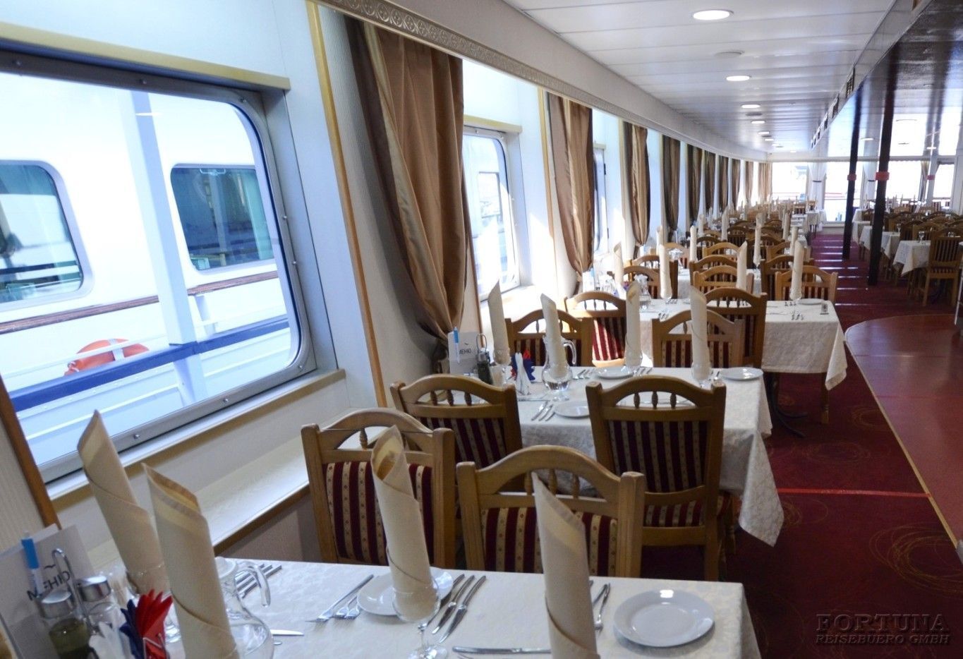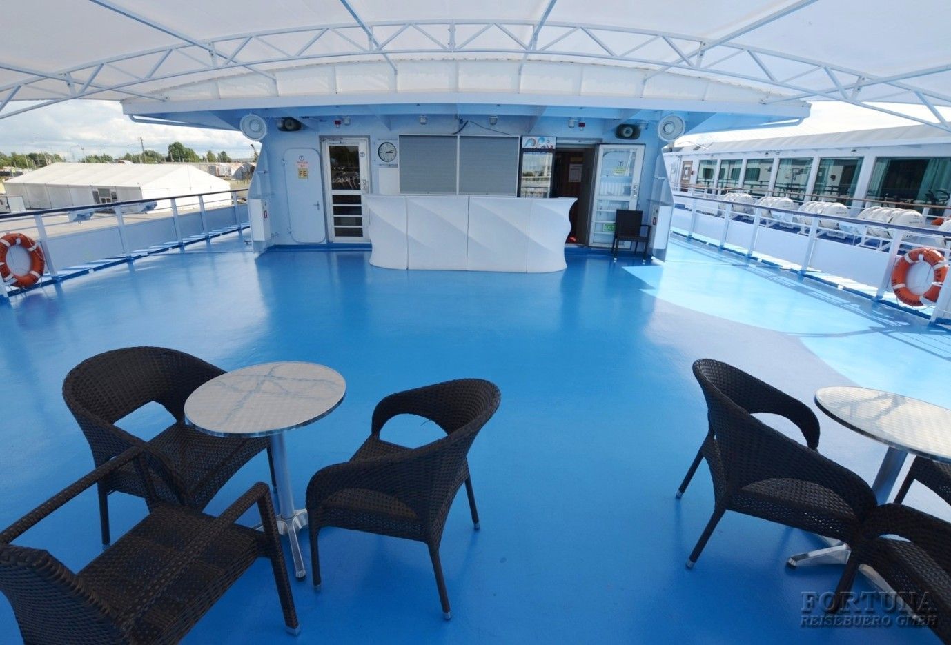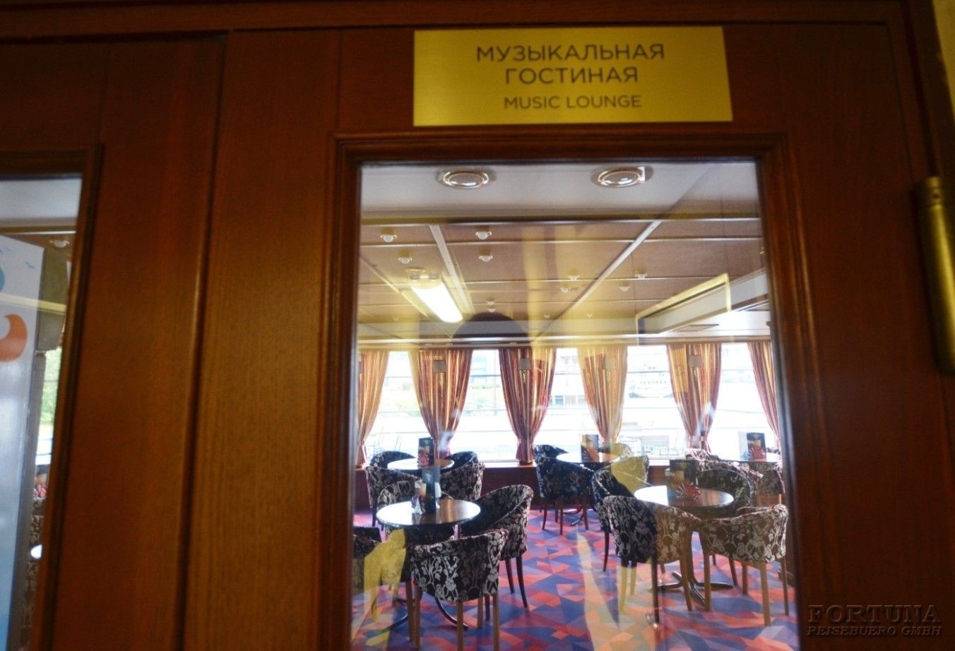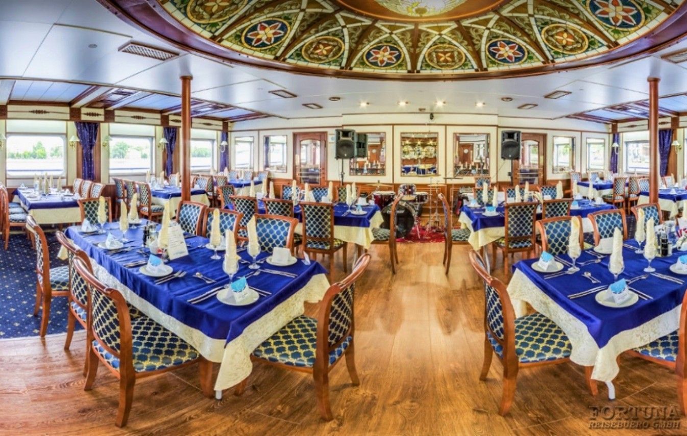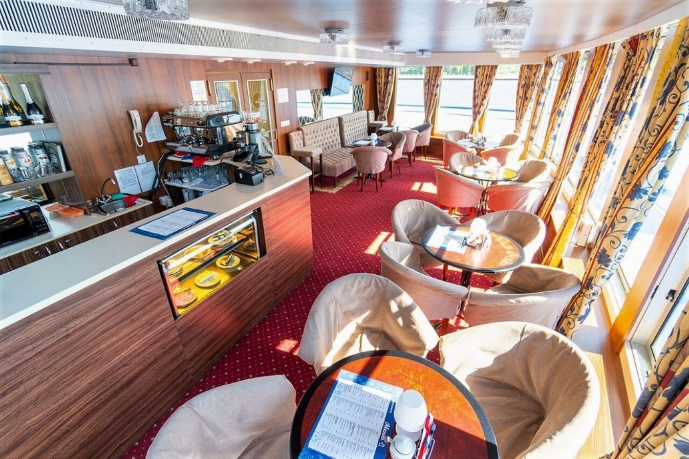 На борту комфортабельного теплохода, ранее работавшего с иностранными туристами, имеется просторный вестибюль со стойкой ресепшен. Приветливый администратор поможет вам с регистрацией на борту и доставкой багажа до забронированной каюты. На ресепшене вам выдадут ключи от каюты и экскурсионную программу круиза - наземные экскурсии можно будет выбрать согласно речному маршруту. Дополнительно вы получите специальные "кредитные карты", которыми можно будет расплатиться за дополнительные экскурсии, в баре и сувенирном киоске теплохода. Что очень удобно - нет надобности с собой на теплоходе носить деньги - все траты записываются на карту, а в конце круиза происходит взаиморасчет и оплата доп. услуг. Правила и условия узнавайте, пожалуйста, при регистрации на рейс на теплоходе.