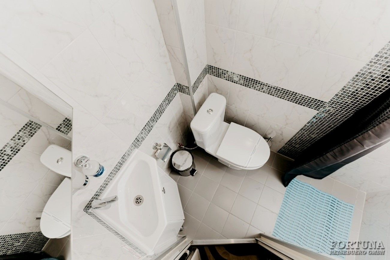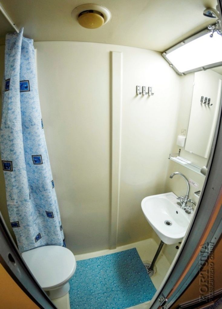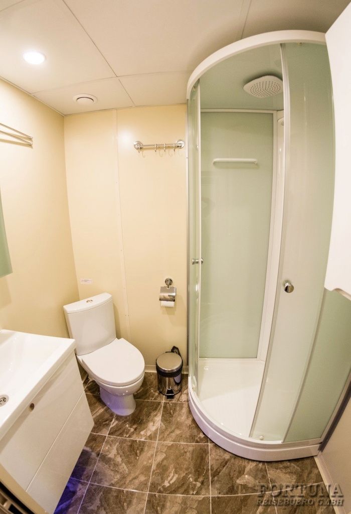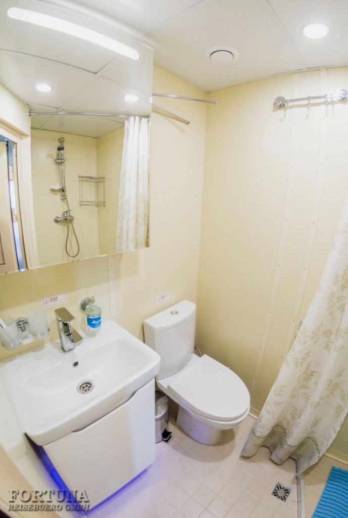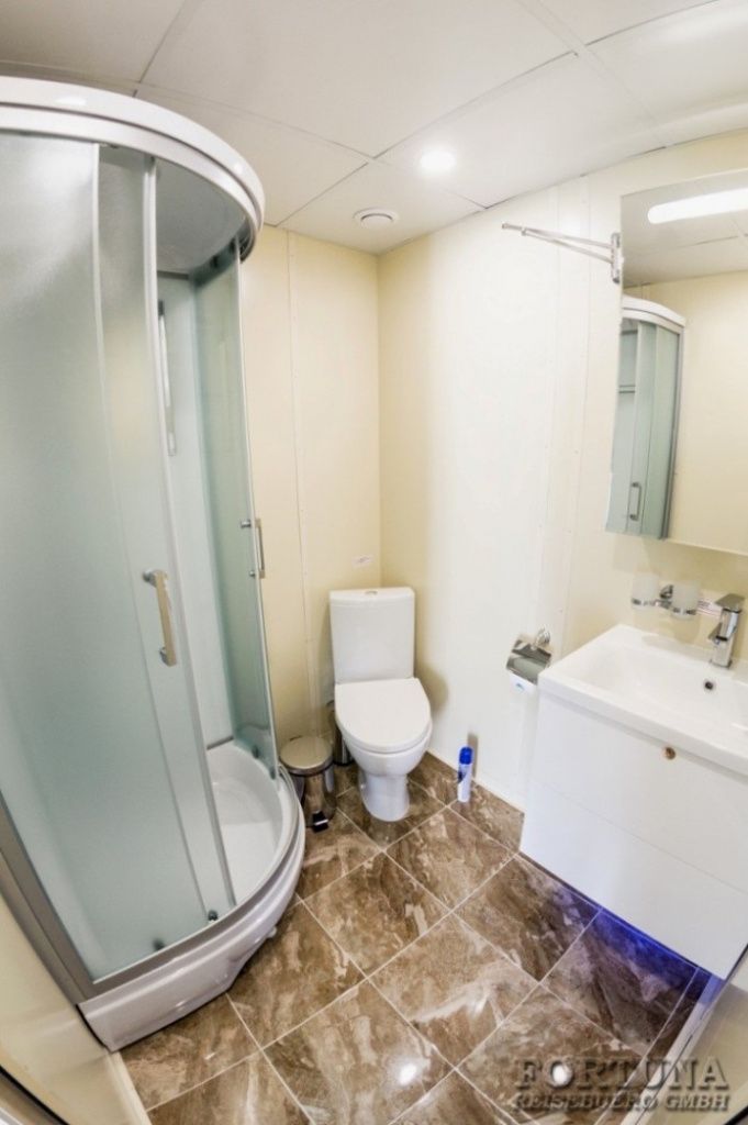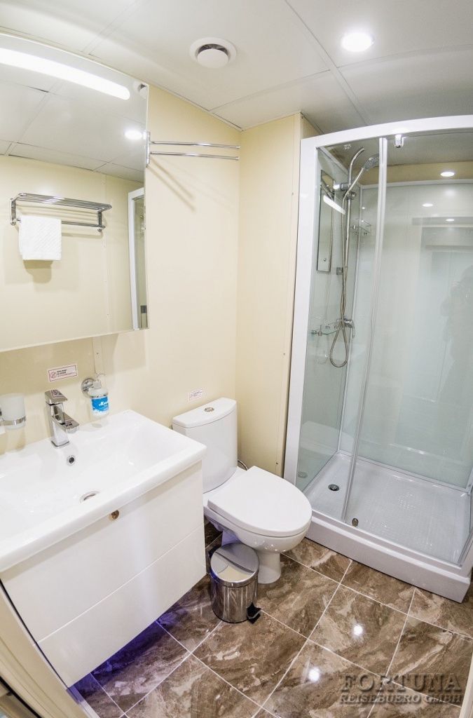 Ванная комната: вход в современный отдельный санузел - душ & WC - ванную комнату каюты осуществляется из спальни. Туалет, раковина с тумбочкой, фен, зеркало с полками и душевая кабина. Туалетные принадлежности и косметика для душа пополняются ежедневно, а также смена полотенец.