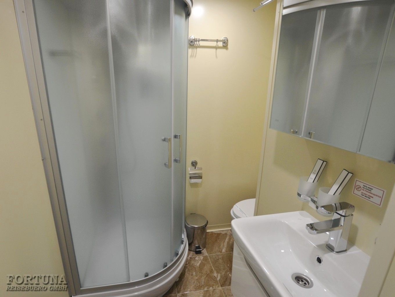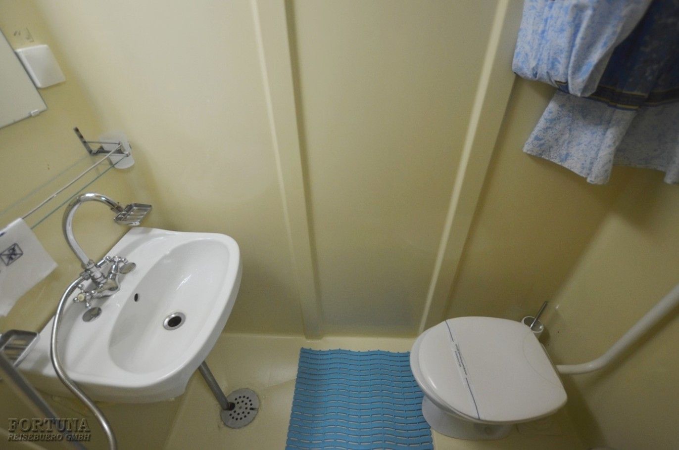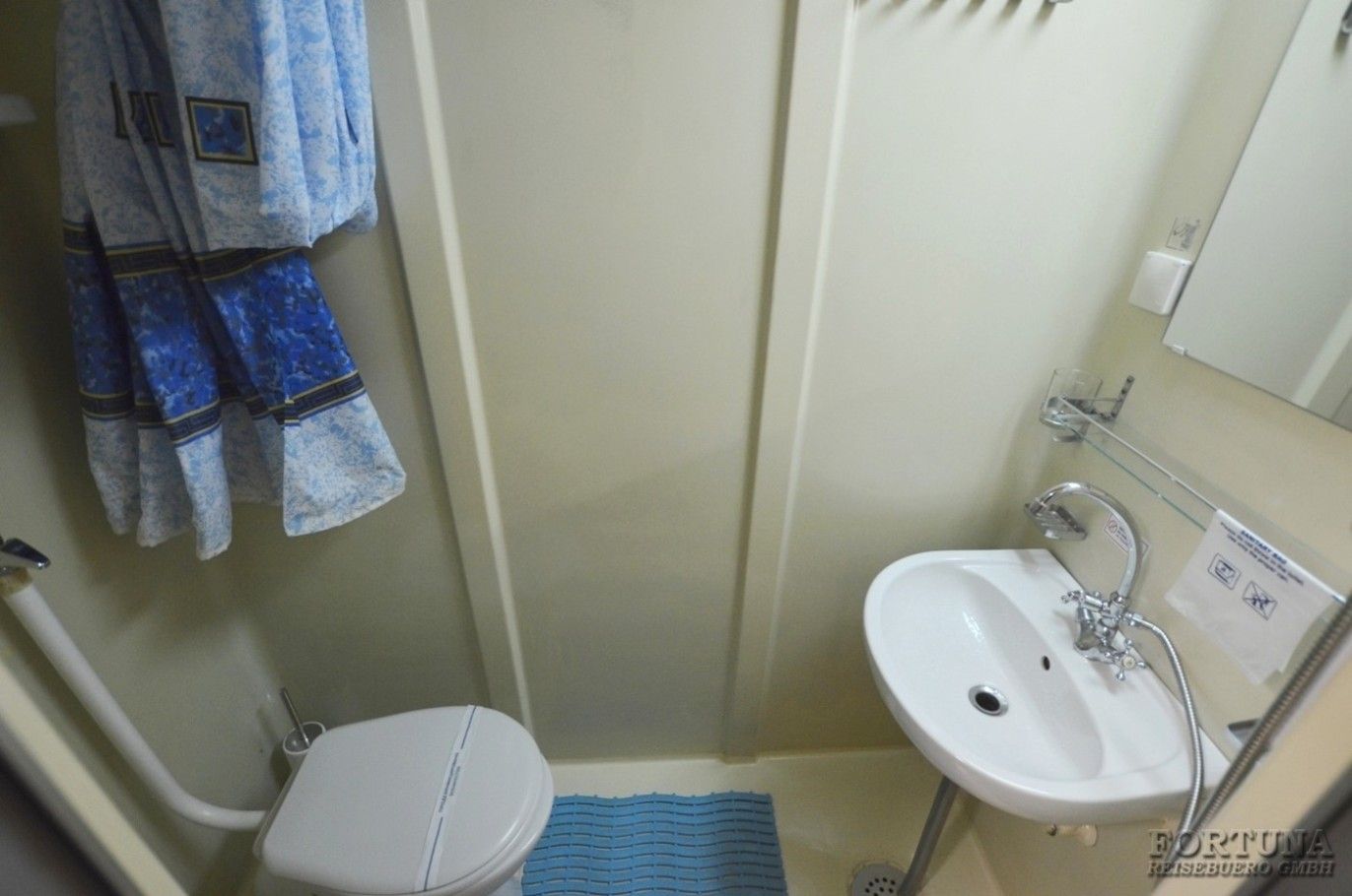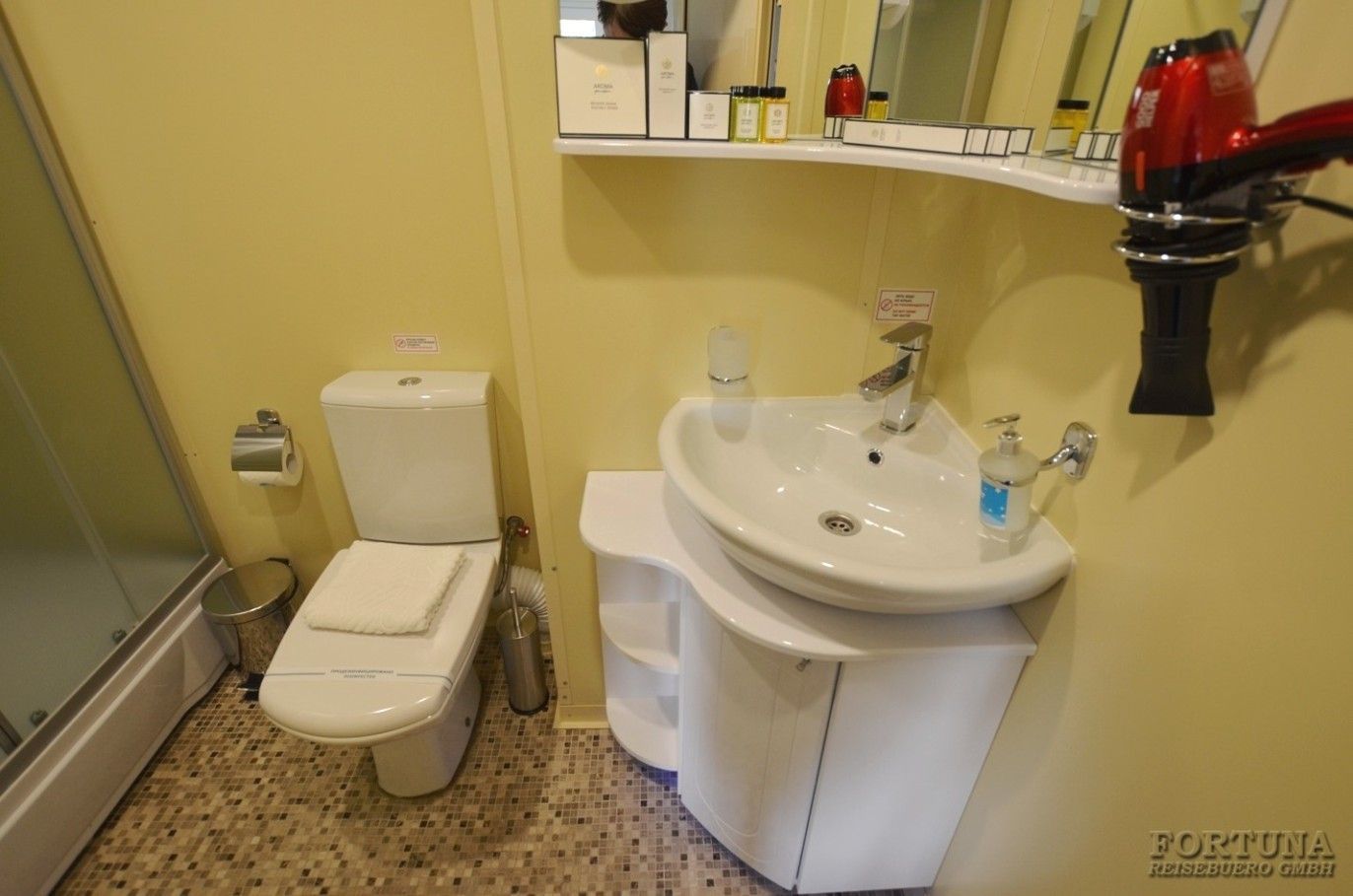 Ванная комната: вход в современный отдельный санузел - душ & WC - ванную комнату каюты осуществляется из спальни. Туалет, раковина с тумбочкой, фен, зеркало с полками и душевая кабина. Туалетные принадлежности и косметика для душа пополняются ежедневно, а также смена полотенец.