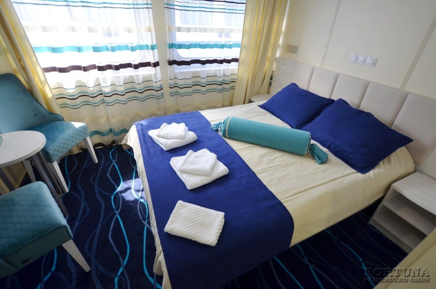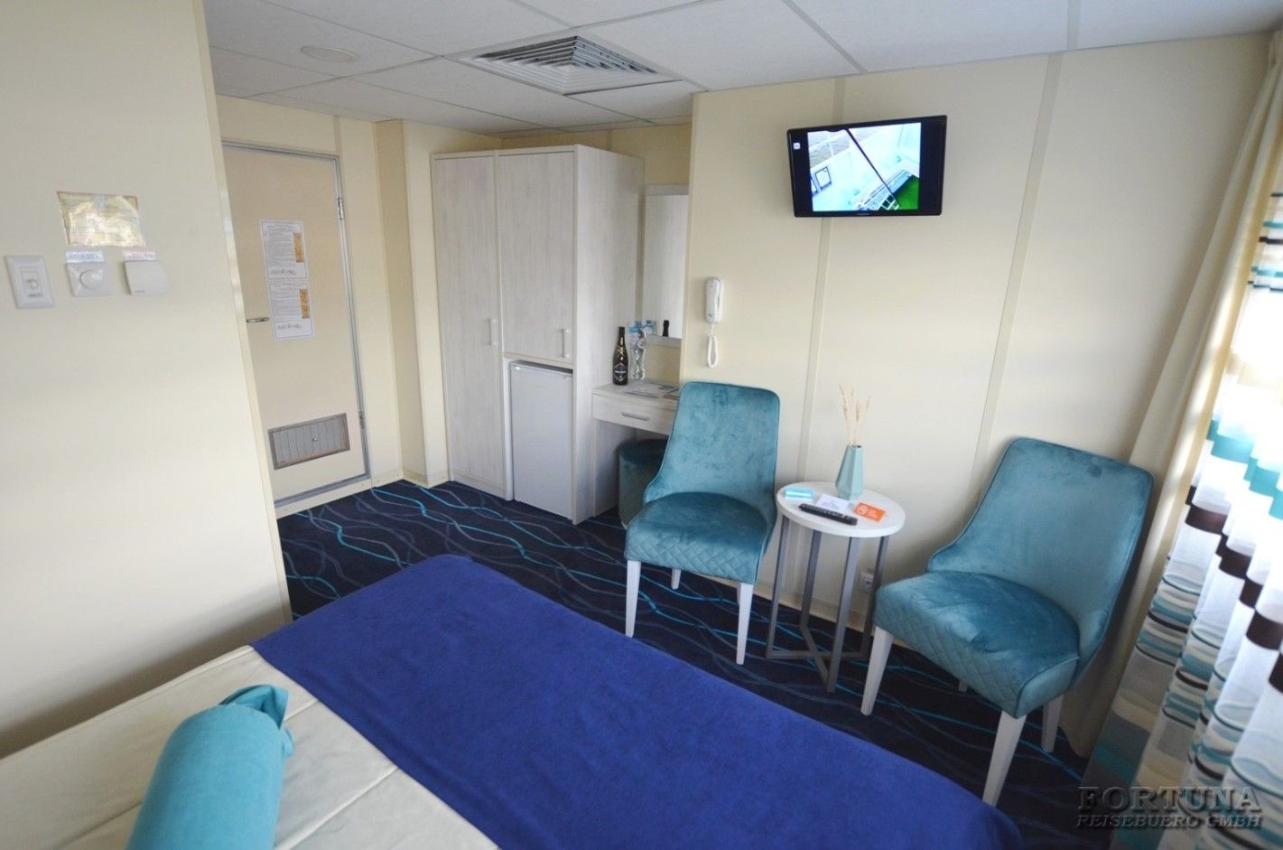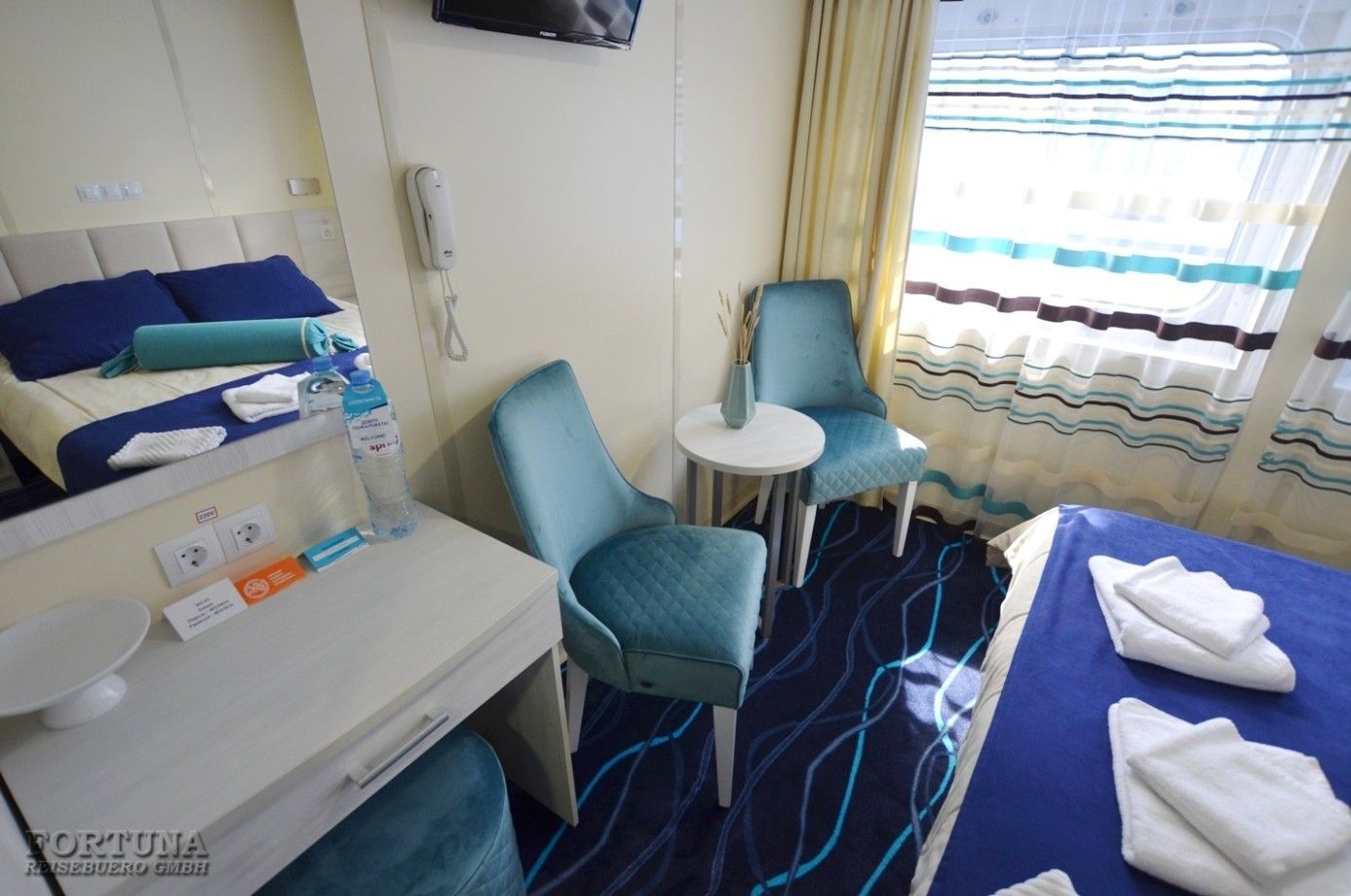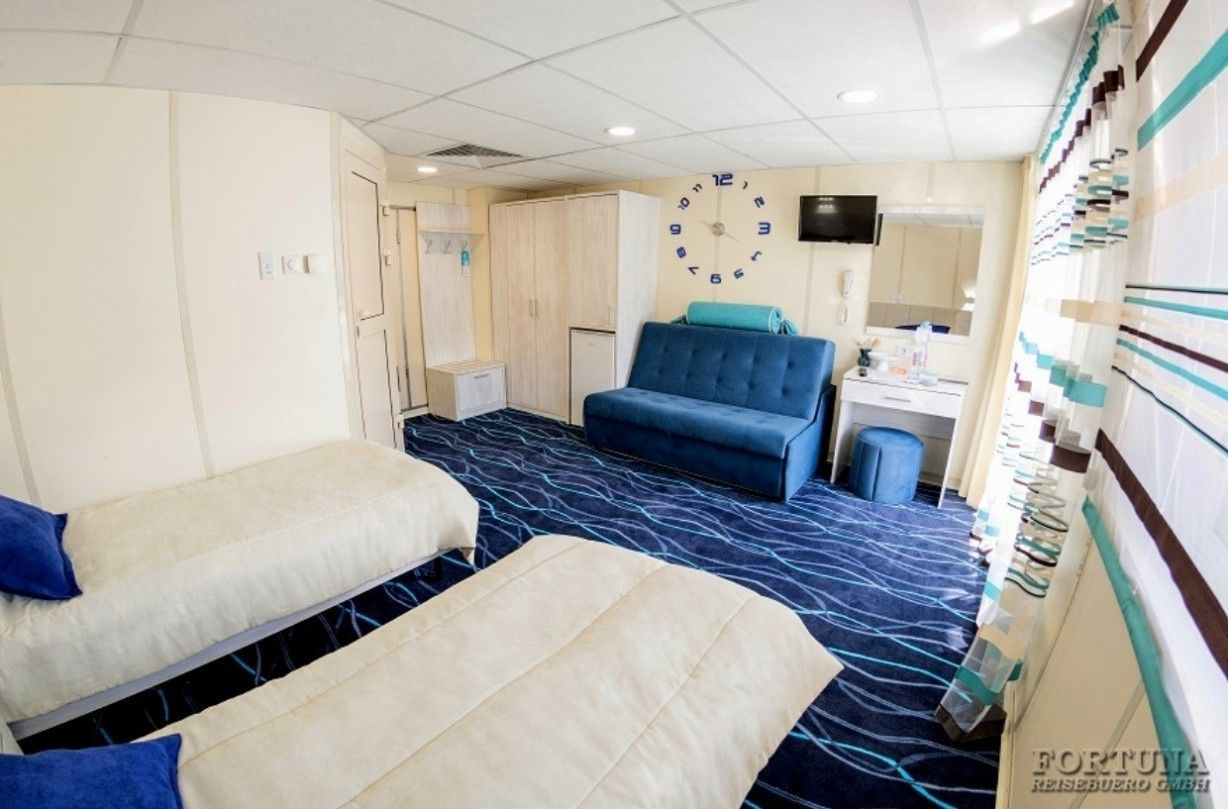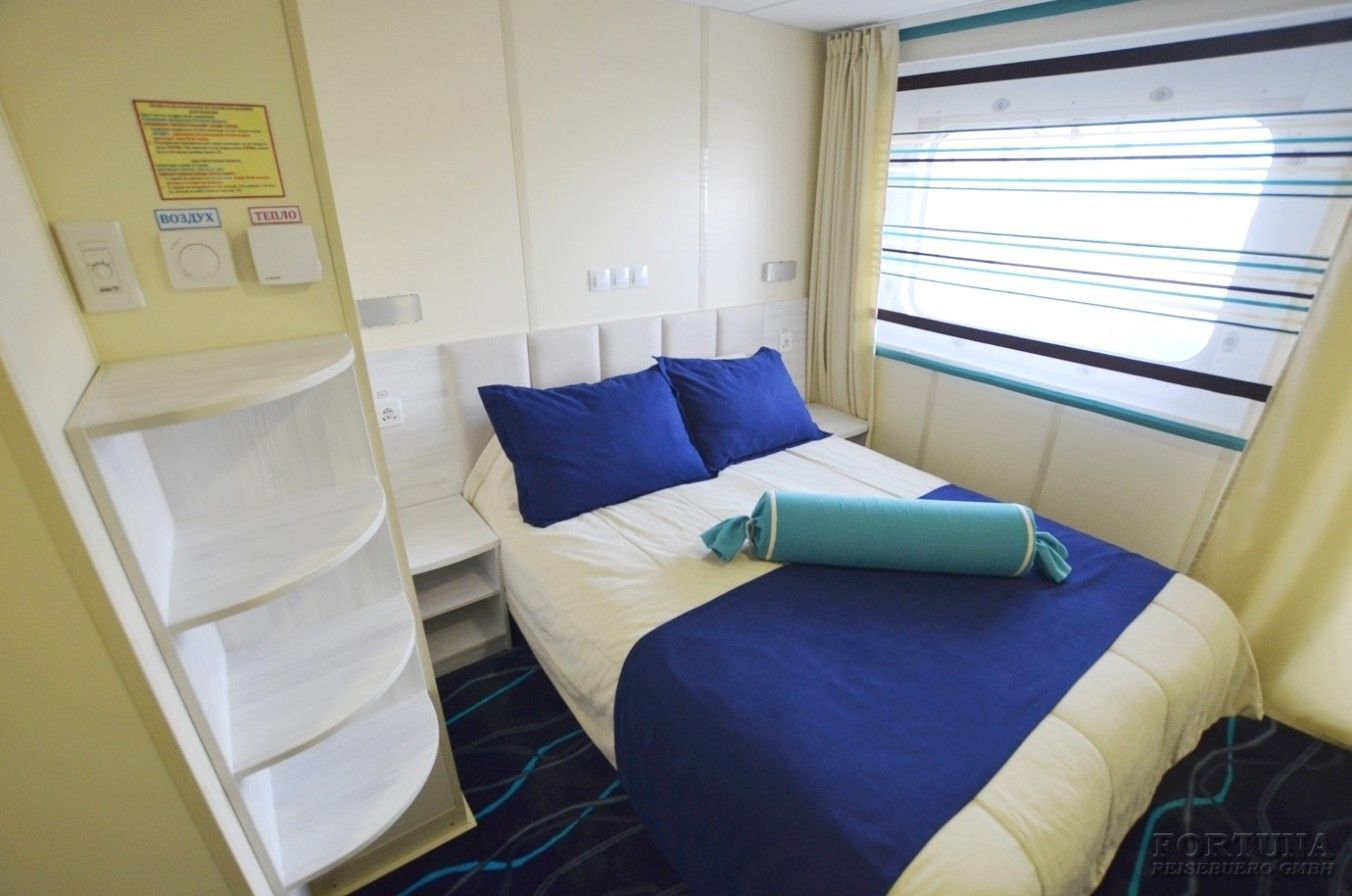 В каюте: одна двуспальная кровать (при необходимости трансформируется в две односпальные кровати), ванная комната (раковина, душевая кабина, туалет), прикроватные тумбы, туалетный стол, пуф, стол журнальный, два кресла, вешалка для верхней одежды, холодильник, кондиционер, радио, шкаф, фен, плед для каждого туриста, сейф, телевизор с кабельным и спутниковым вещанием, телефон, wi-fi роутер, розетки 220 V, два обзорных окна.