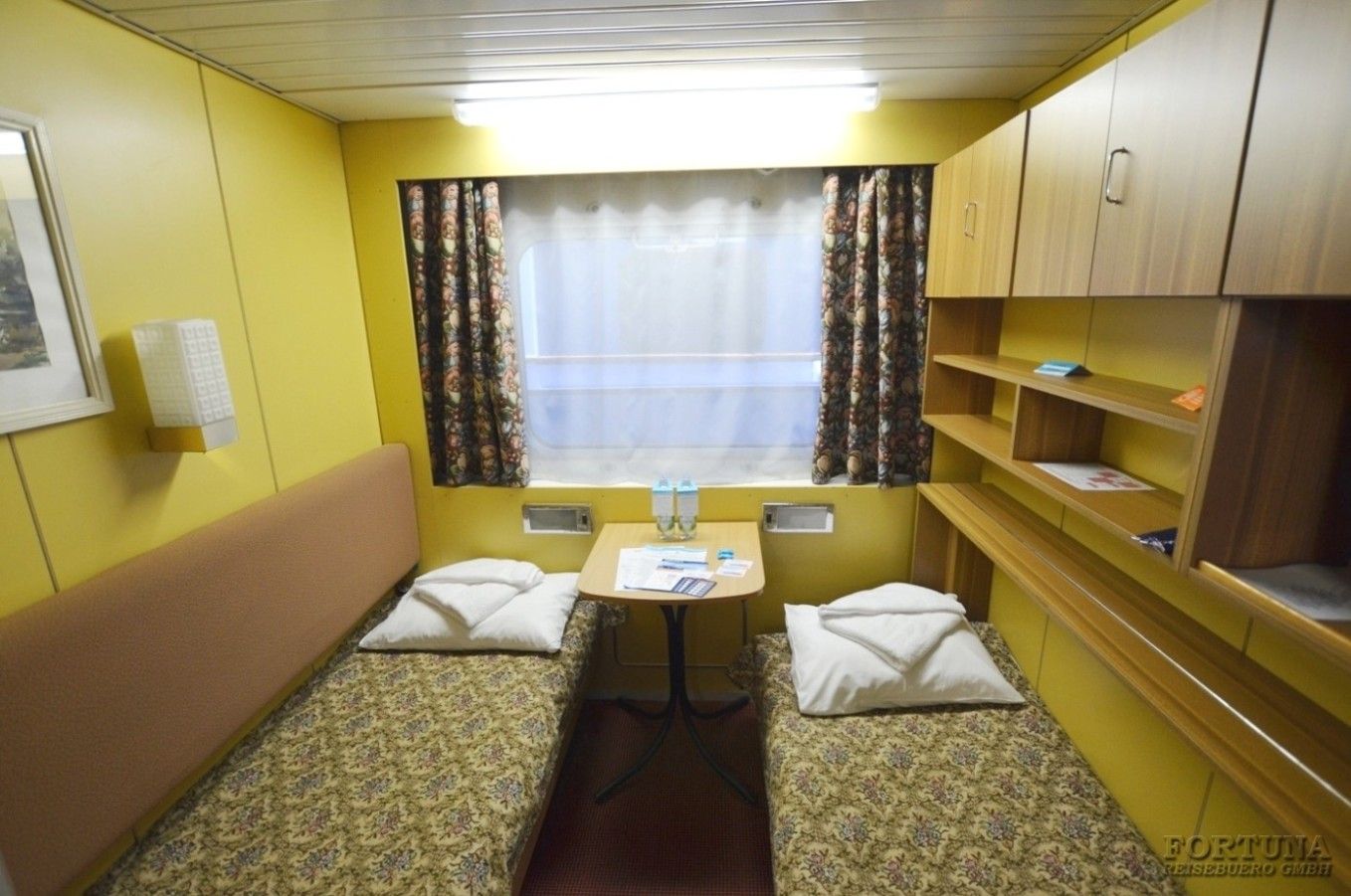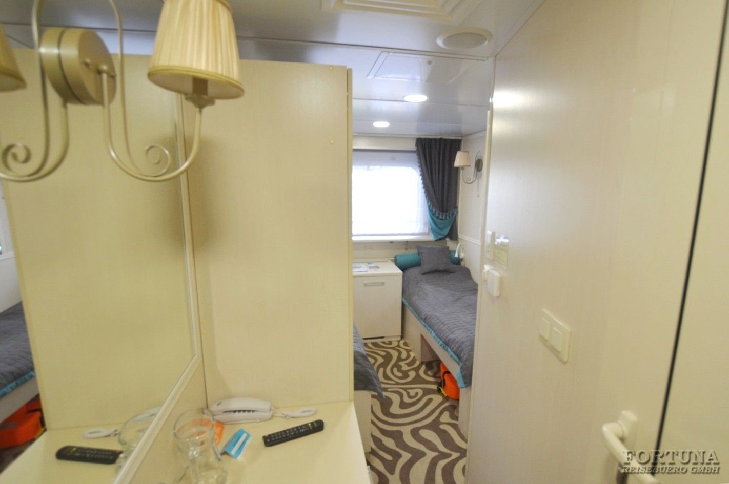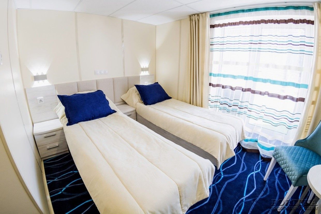 В уютных каютах одно большое открывающееся обзорное окно, две односпальные кровати-полки (нельзя сдвинуть), плазменный телевизор, светильники, настенные полки, прикроватный столик, бортовое радио, мини-холодильник, внутренний телефон, розетки 220 V. В небольшой прихожей есть зеркало с гардеробной и вместительный шкаф для одежды.