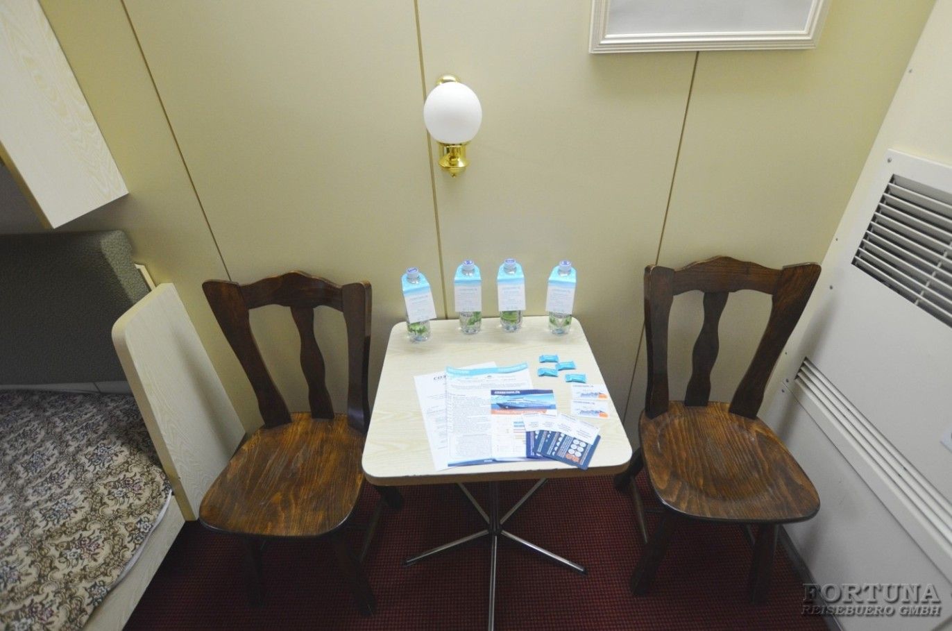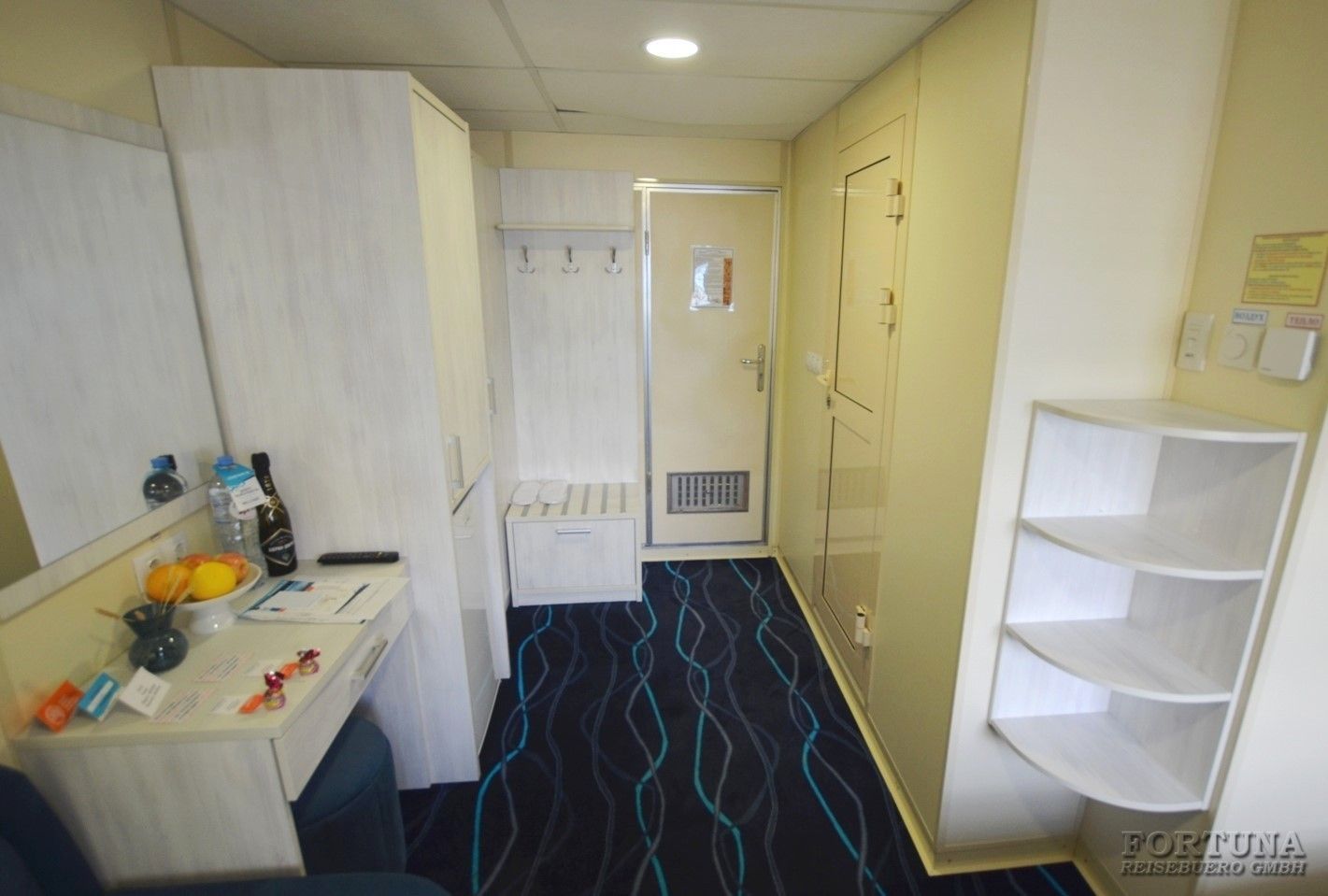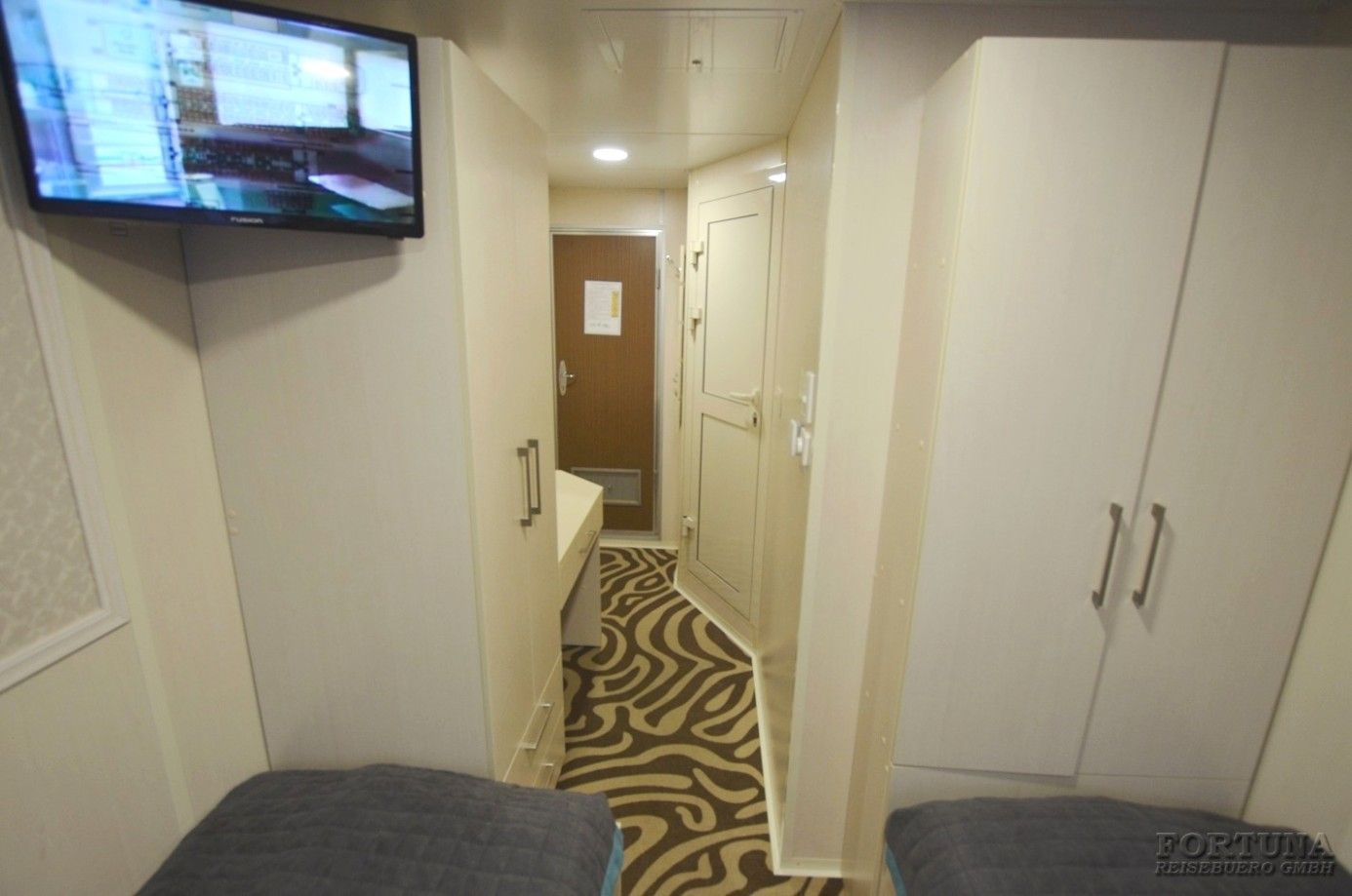 В уютных каютах одно большое открывающееся обзорное окно, две односпальные кровати-полки (нельзя сдвинуть), плазменный телевизор, светильники, настенные полки, прикроватный столик, бортовое радио, мини-холодильник, внутренний телефон, розетки 220 V. В небольшой прихожей есть зеркало с гардеробной и вместительный шкаф для одежды.