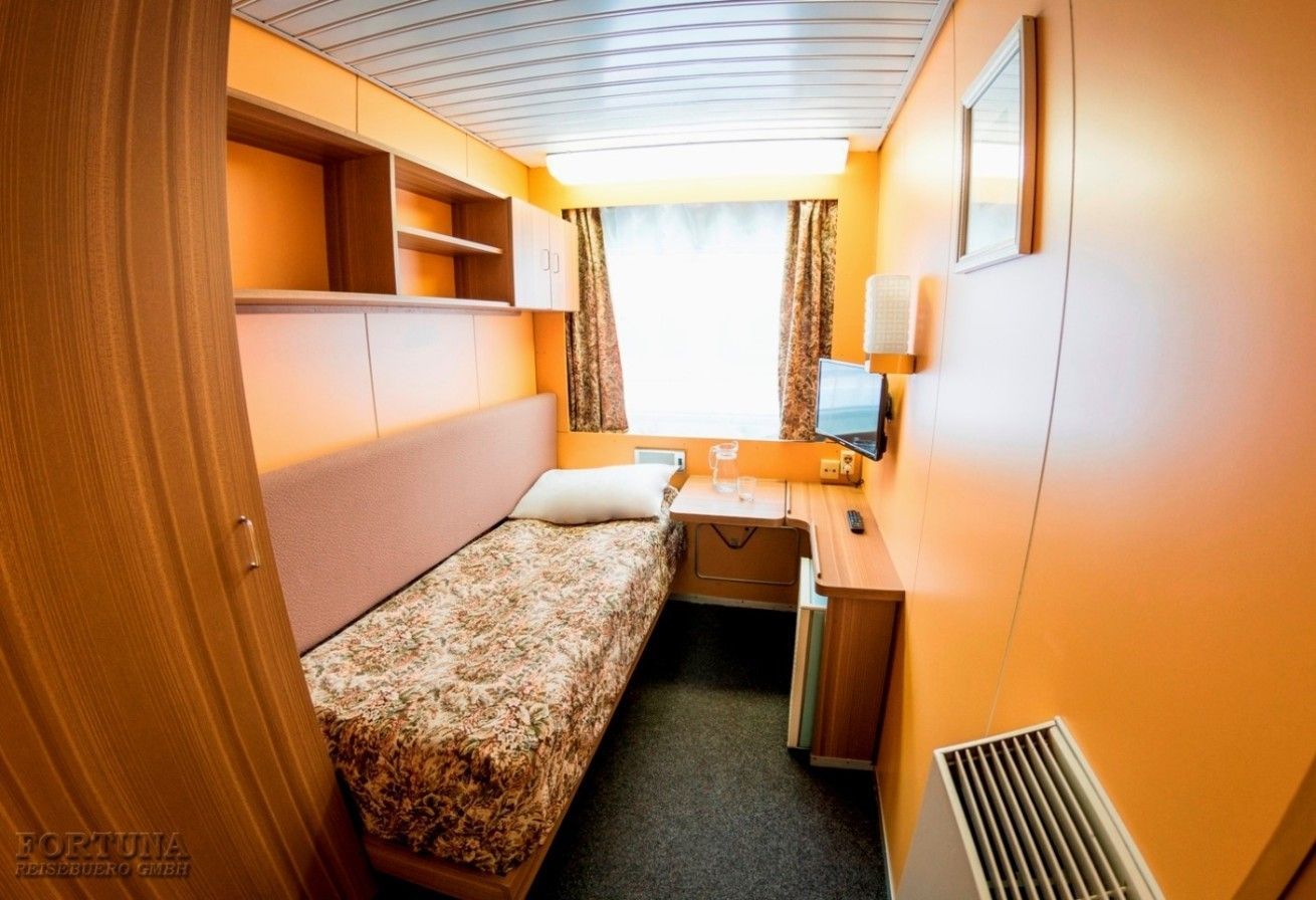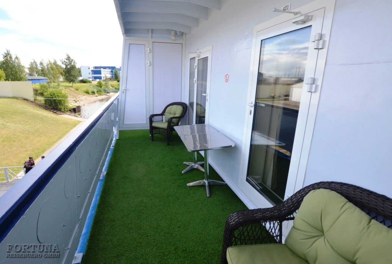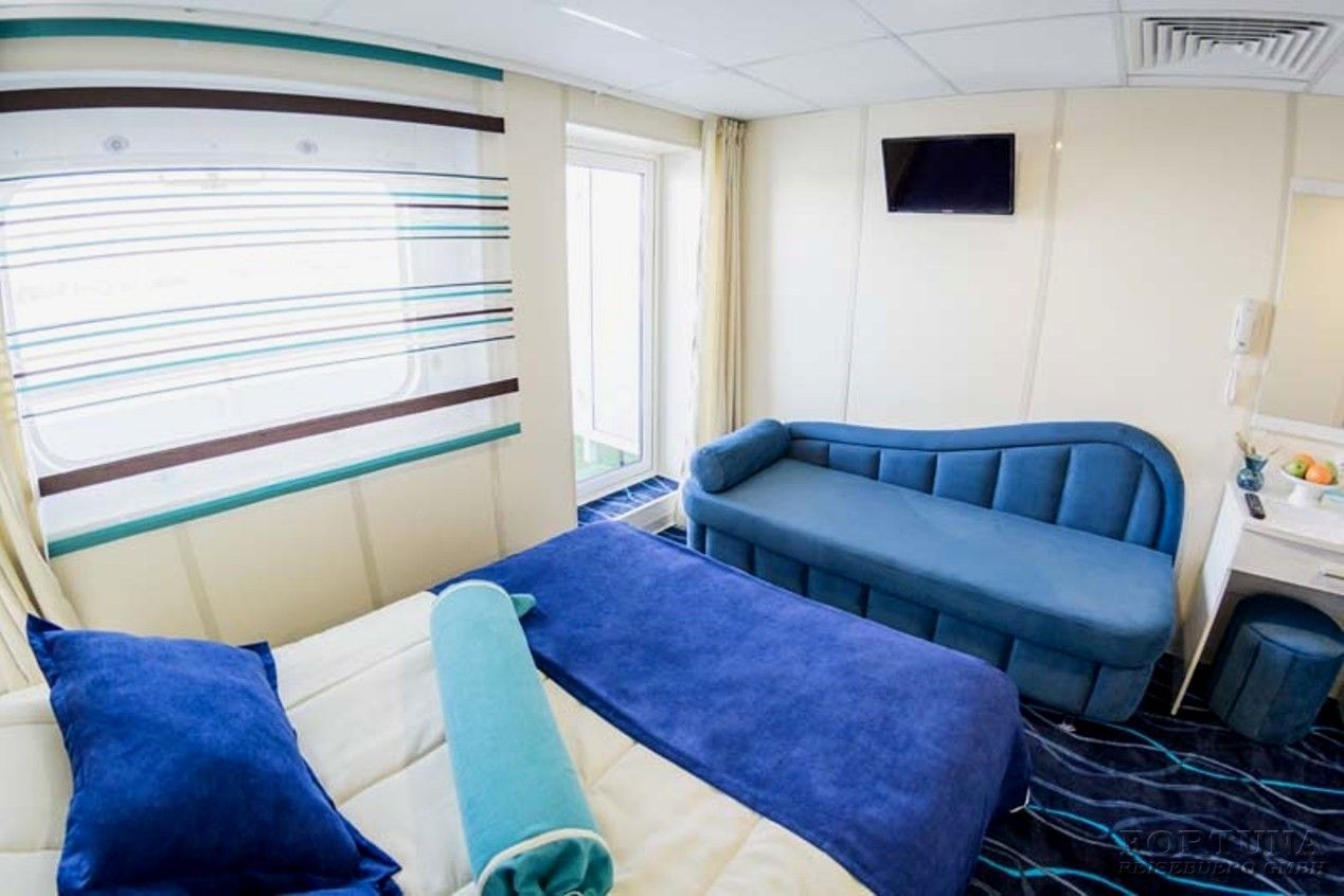 В каюте: односпальная кровать, дополнительное спальное место верхнего расположения (откидная полка), ванная комната (раковина, душ, туалет), кресло, туалетный стол, пуф, шкаф, холодильник, радио, фен, плед для каждого туриста, телевизор с кабельным и спутниковым вещанием, кондиционер, розетки 220 V, щетка для одежды, стеклянная балконная дверь-окно, персональный балкон с мебелью для отдыха.