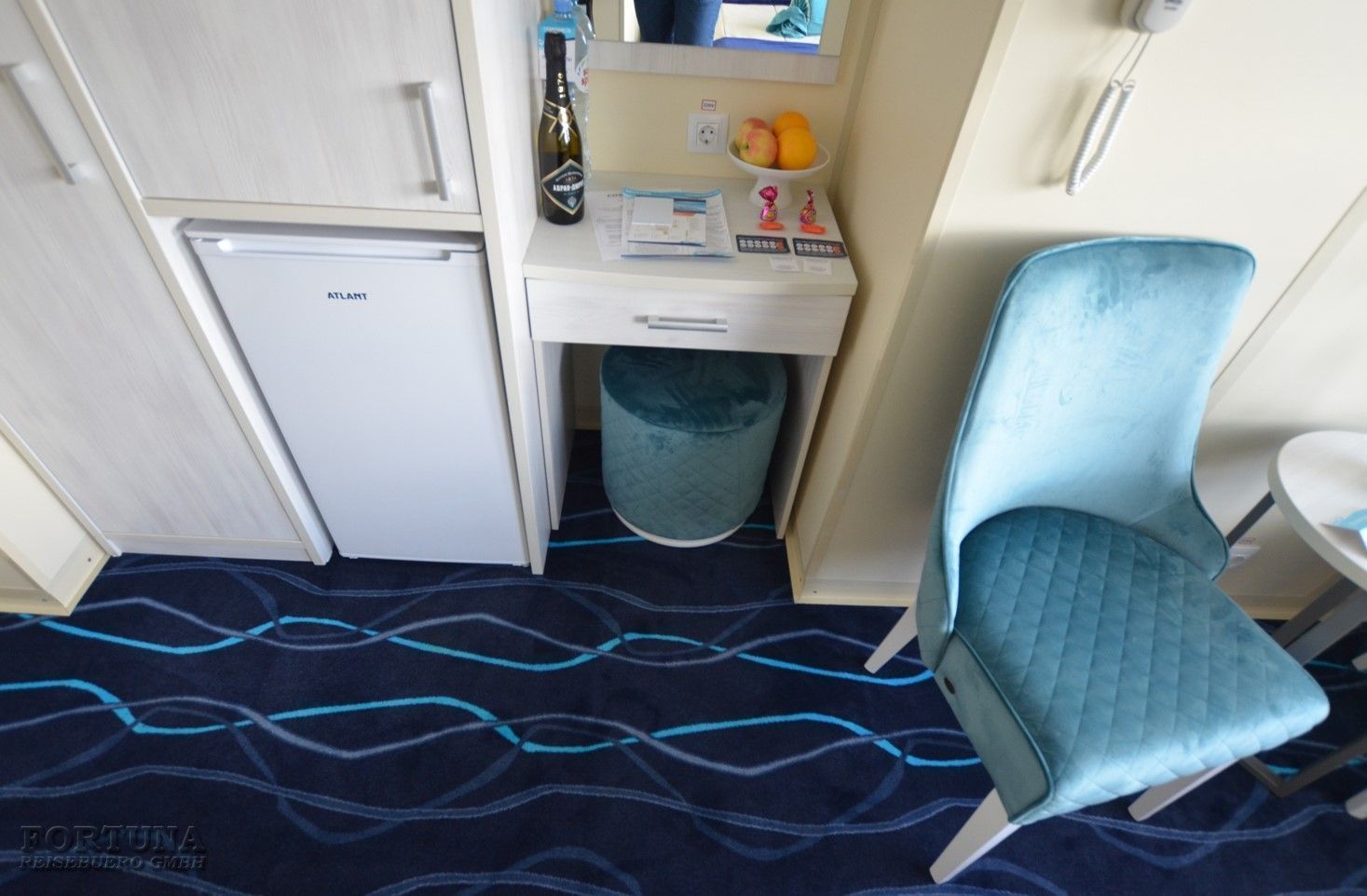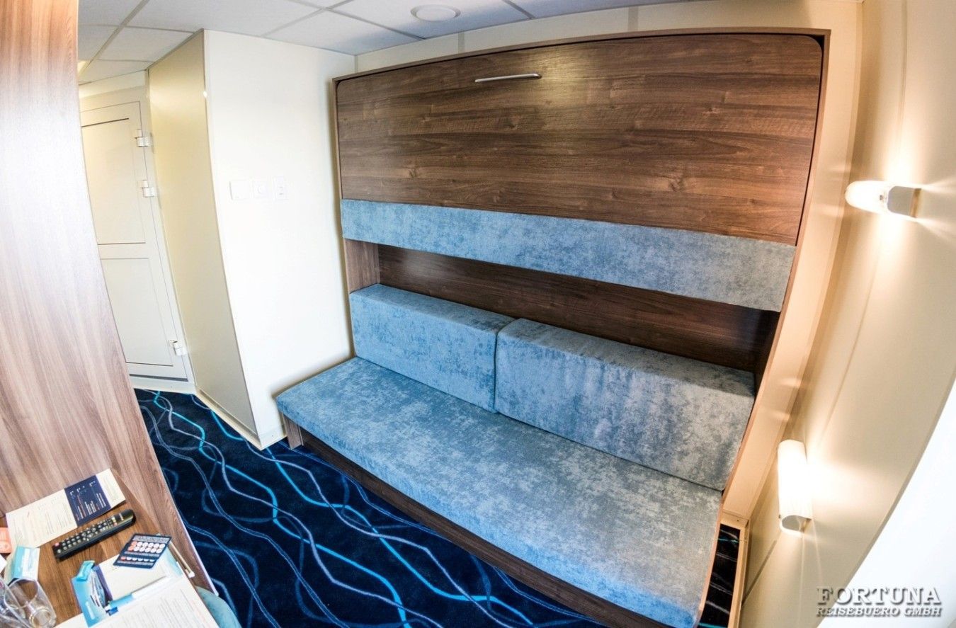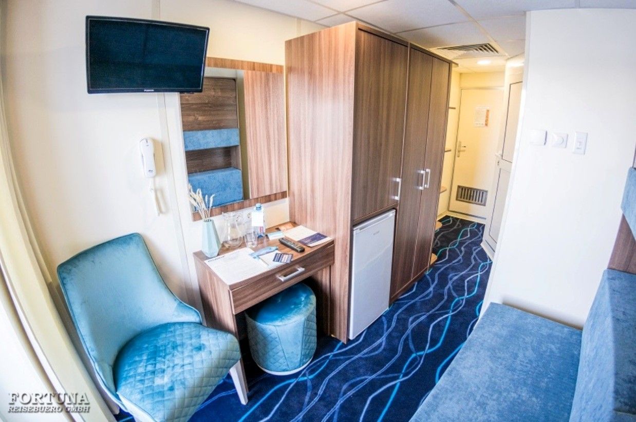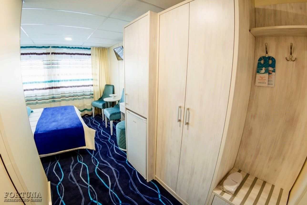 В каюте: односпальная кровать, дополнительное спальное место верхнего расположения (откидная полка), ванная комната (раковина, душ, туалет), кресло, туалетный стол, пуф, шкаф, холодильник, радио, фен, плед для каждого туриста, телевизор с кабельным и спутниковым вещанием, кондиционер, розетки 220 V, щетка для одежды, стеклянная балконная дверь-окно, персональный балкон с мебелью для отдыха.