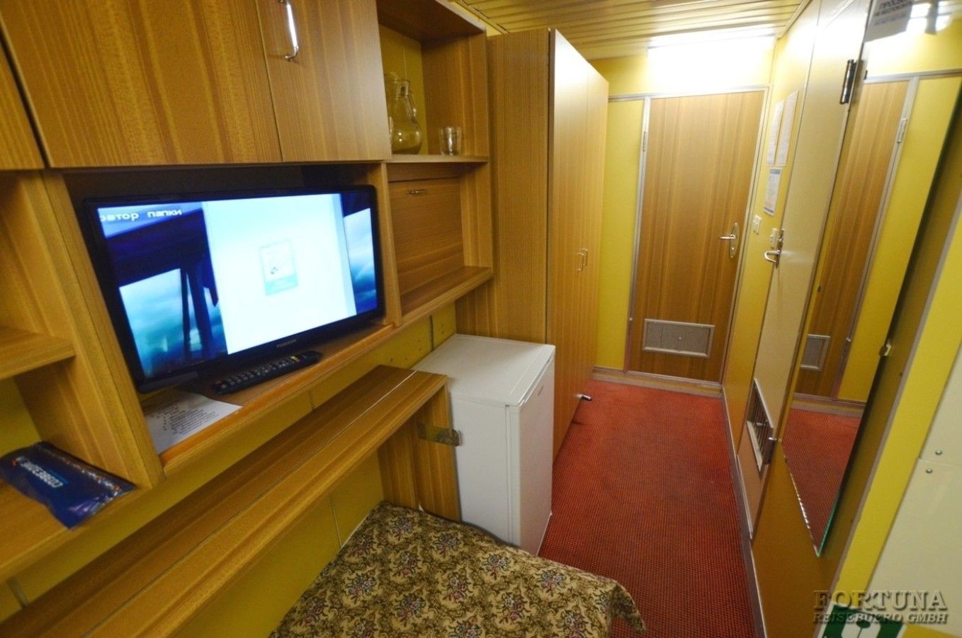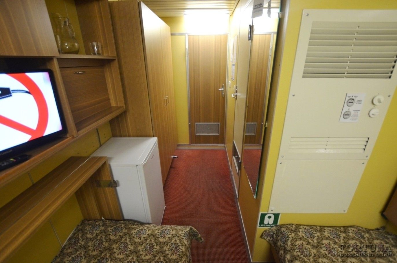 В уютных каютах одно большое открывающееся обзорное окно, две односпальные кровати-полки (нельзя сдвинуть), плазменный телевизор, светильники, настенные полки, прикроватный столик, мини-холодильник, внутренний телефон, бортовое радио, розетки 220 V. В небольшой прихожей есть зеркало с гардеробной и вместительный шкаф для одежды.
