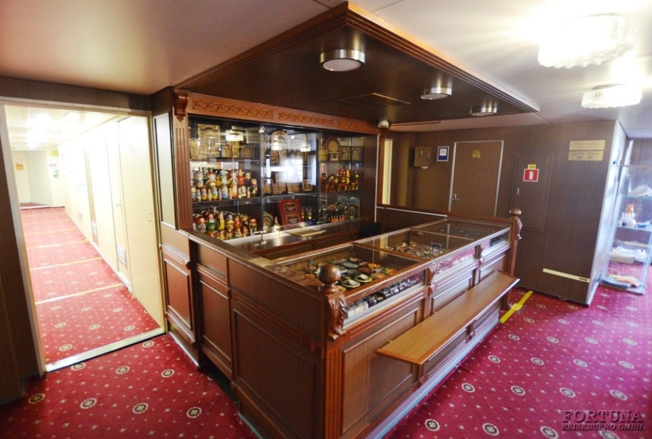 Сувенирный киоск – привезти с собой памятный подарок, или приобрести что-то необходимое для путешествия. Часы работы уточняйте у дирекции круиза. Гладильная комната – расположена на главной палубе, здесь для гостей предоставляются утюги и гладильные столы, которыми можно воспользоваться совершенно бесплатно. Пожалуйста, обратите внимание, что перед ужином или во время речных дней между портами - эти временные промежутки самое востребованное.Библиотека русской литературы & Ресепшен