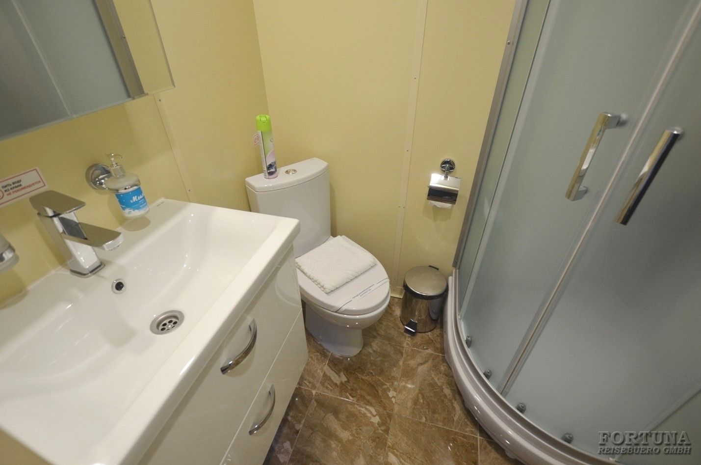 Ванная комната: современный отдельный санузел - душ & WC - туалет, раковина с тумбочкой, фен, зеркало и современная душевая кабина. Туалетные принадлежности и косметика для душа пополняются ежедневно, а также смена полотенец.
