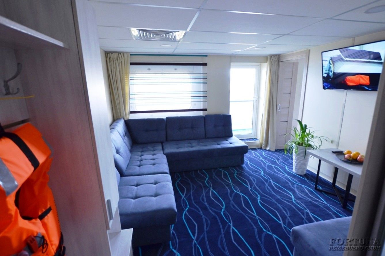 В каюте: одна двуспальная кровать (при необходимости трансформируется в две односпальные кровати), ванная комната (раковина, душевая кабина, туалет), прикроватные тумбы, односпальный диван, шкаф, вешалка для верхней одежды, туалетный стол, пуф, холодильник, кондиционер, радио, сейф, фен, wi-fi роутер, плед для каждого туриста, телевизор с кабельным и спутниковым вещанием, телефон, розетки 220 V, обзорное окно, стеклянная балконная дверь, персональный балкон с мебелью для отдыха.