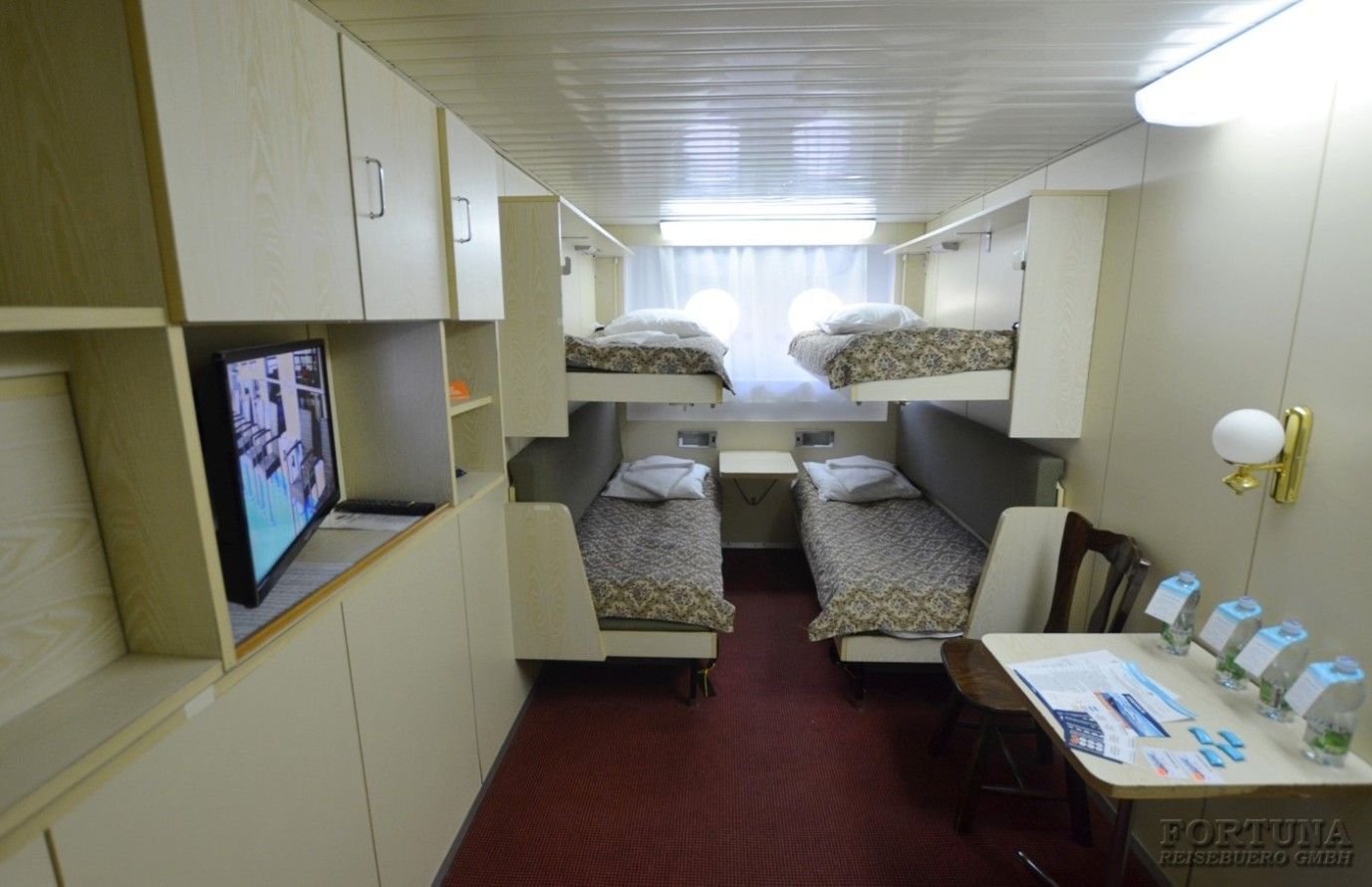 В уютных каютах два не открывающихся иллюминатора, две односпальные кровати-полки внизу и две на верху, плазменный телевизор, светильники, настенные полки, прикроватный столик, два стула, мини-холодильник, внутренний телефон, бортовое радио, розетки 220 V. В небольшой прихожей есть зеркало с гардеробной и вместительный шкаф для одежды.