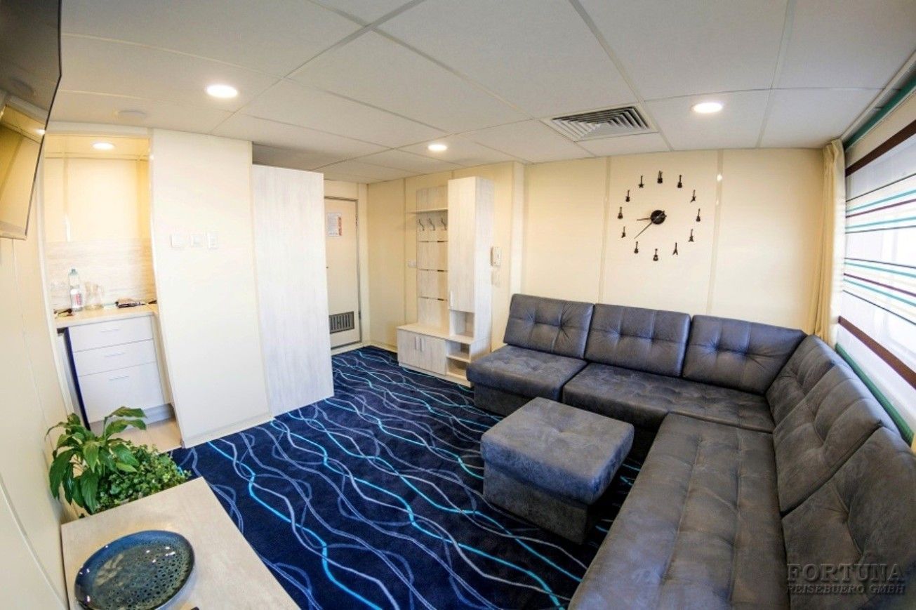 В комфортабельных каютах: панорамное окно, одна двуспальная кровать (при необходимости трансформируется в две односпальные кровати), настенные бра, 2 прикроватные тумбы, банкетка, большой диван (раскладывается), стол с зеркалом, сейф, мини-холодильник, плазменный телевизор с кабельным и спутниковым вещанием, внутренний телефон, бортовое радио, розетки 220 V, wi-fi роутер. Каюта украшена большими настенными часами. В прихожей небольшой гардероб и вместительный платяной шкаф.