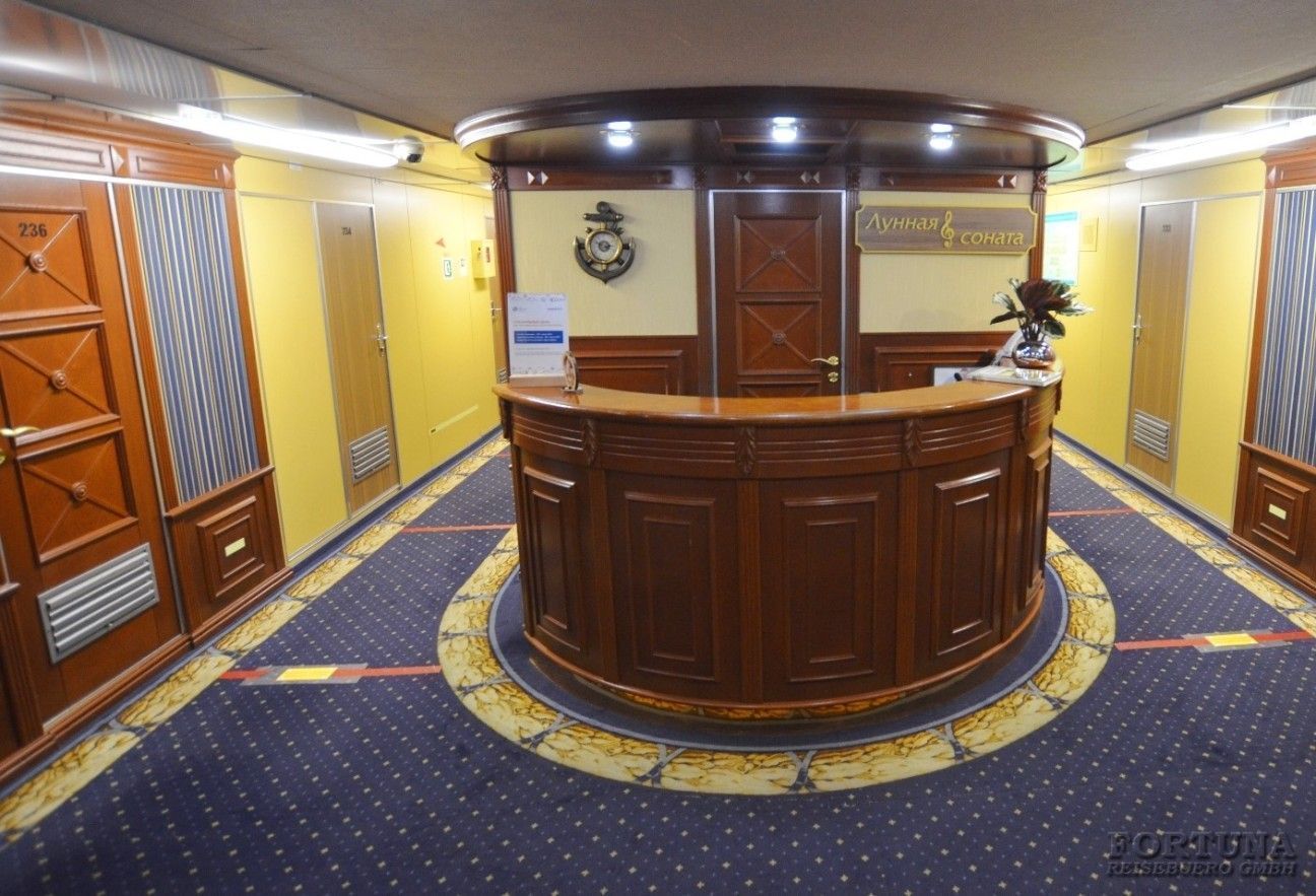 Первые впечатления пассажиров от теплохода Лунная соната начинаются именно с этой зоны, поэтому ресепшен выглядит достаточно современно. Всё сделано для того, чтобы каждому пассажиру, вступившему на теплоход и подошедшему к ресепшен, не чувствовалось никакого эмоционального дискомфорта, а наоборот, он расслабился, проникся доверительными отношениями к теплоходу и экипажу.